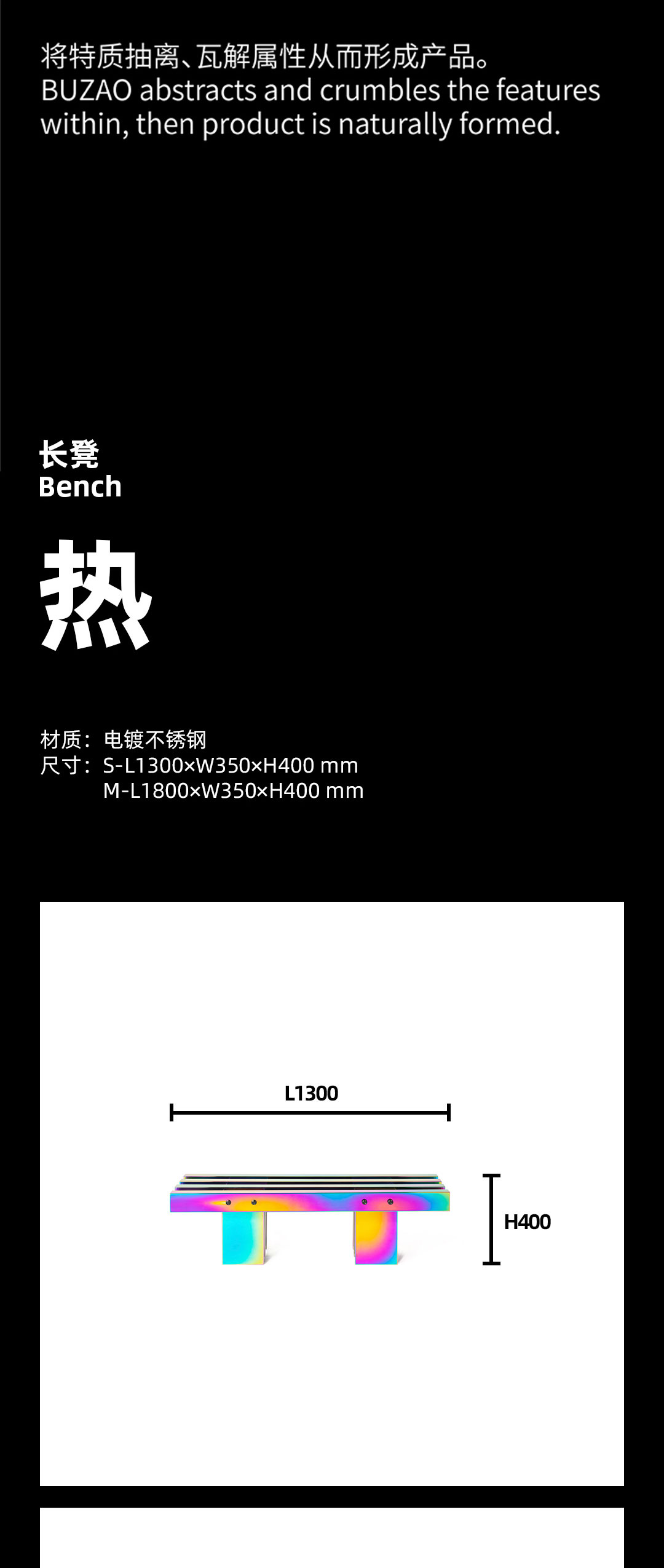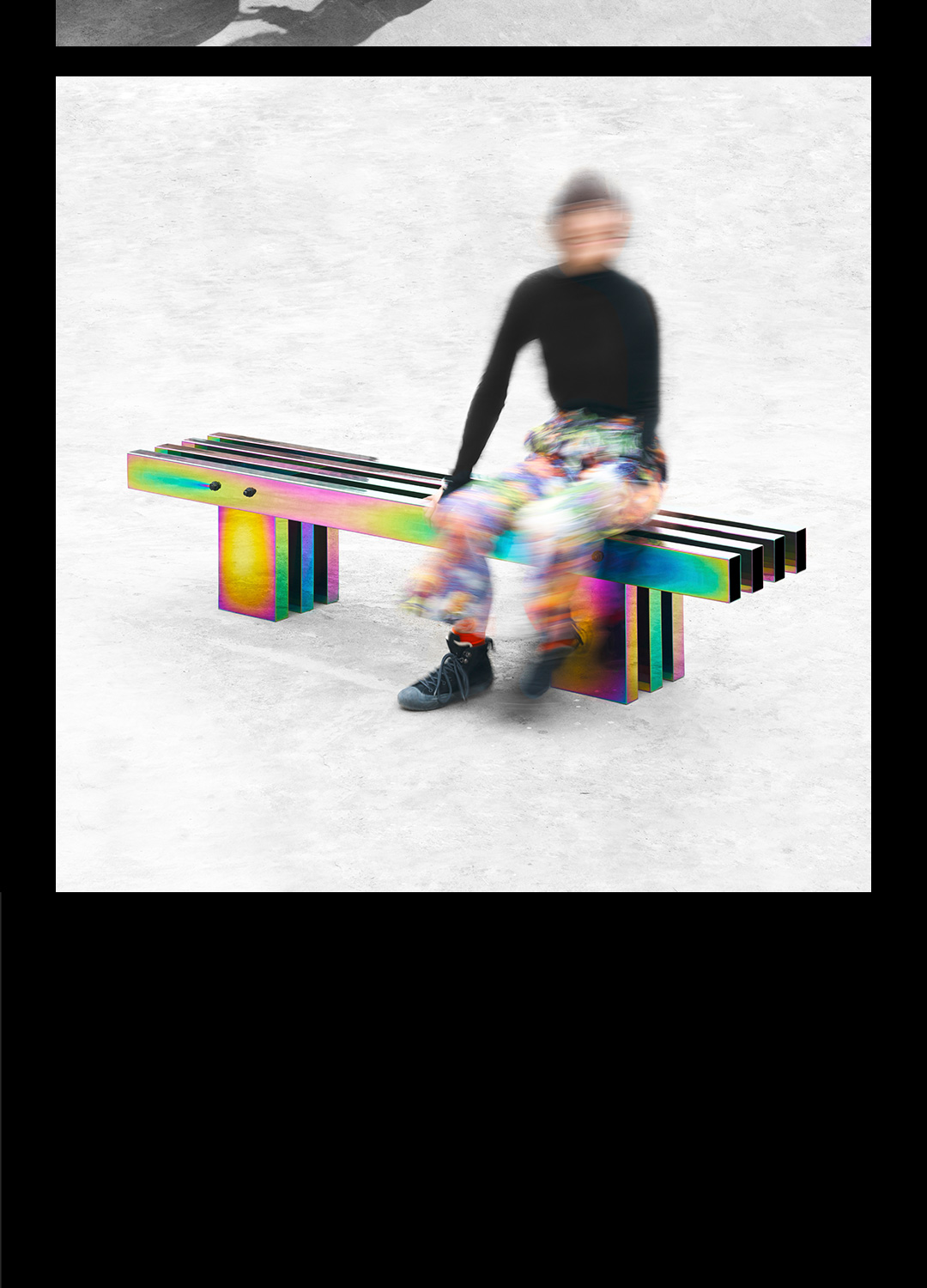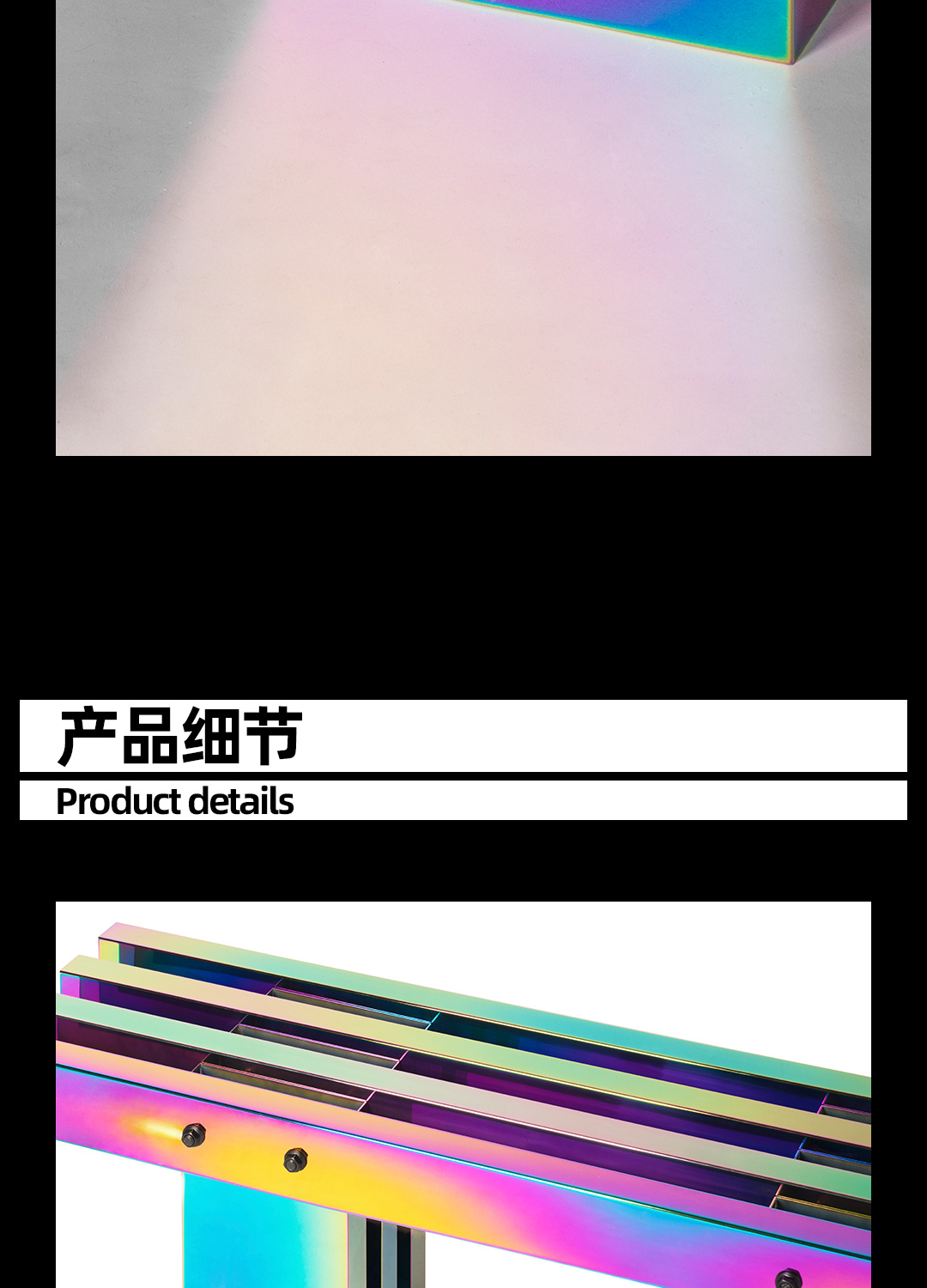 剧烈迷幻至热至冷的撞色,不遗漏任一可见光的波段,色相在连续折面上像热象图解析呈现。 镜面反射,形体纵横正立间增加色相交叠变化,与环境投射的光或影相互如实反馈。