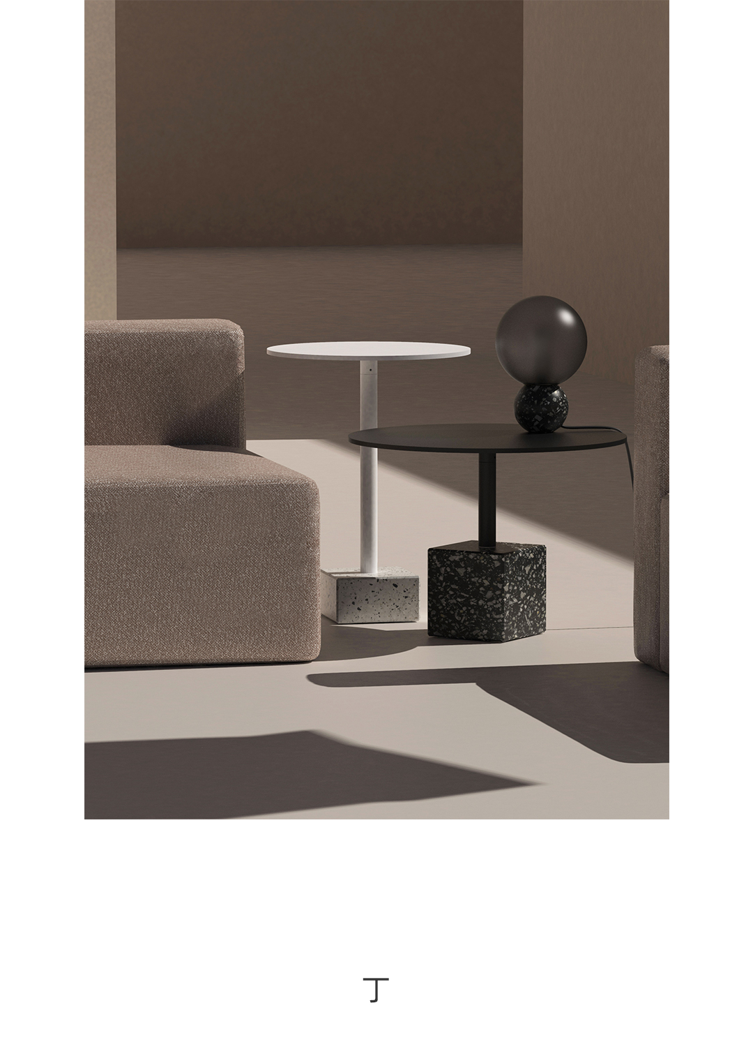 水磨石边几 全铝金属桌面不生锈,耐候粉末喷涂抗紫外线耐候不变色,致密表面防油污,室内户外通用。 全铝精密加工,部件均可拆卸,减少包装体积,降低运输成本。 回收石材边角料,与混凝土混合后打磨,形成经典的水磨石质感,呈现透气自然的机理,是旧时光的记忆。 简约黑白的经典搭配,致密的材料应用,便于清洁维护,适应户外、室内各类风格的公共区域。