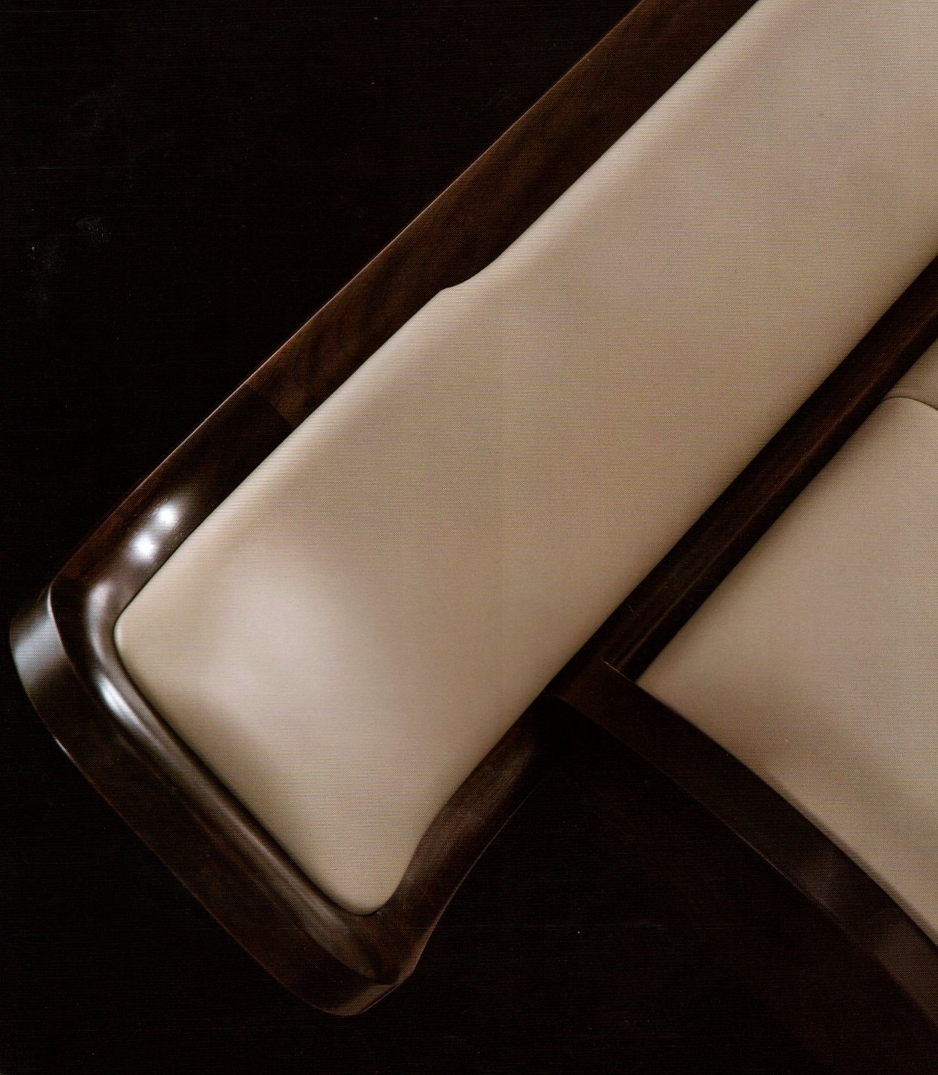 1.床高片造型源于中式官帽,出人头地,生活一帆风顺的美好寓意。同时呈环抱状,寓意夫妻关爱包容,幸福和睦。 2.床高片皮质软包设计,并饰以铜条装饰,舒适耐用,细节精致。 3.铜脚设计,赋予中式韵味的同时以防磨损。