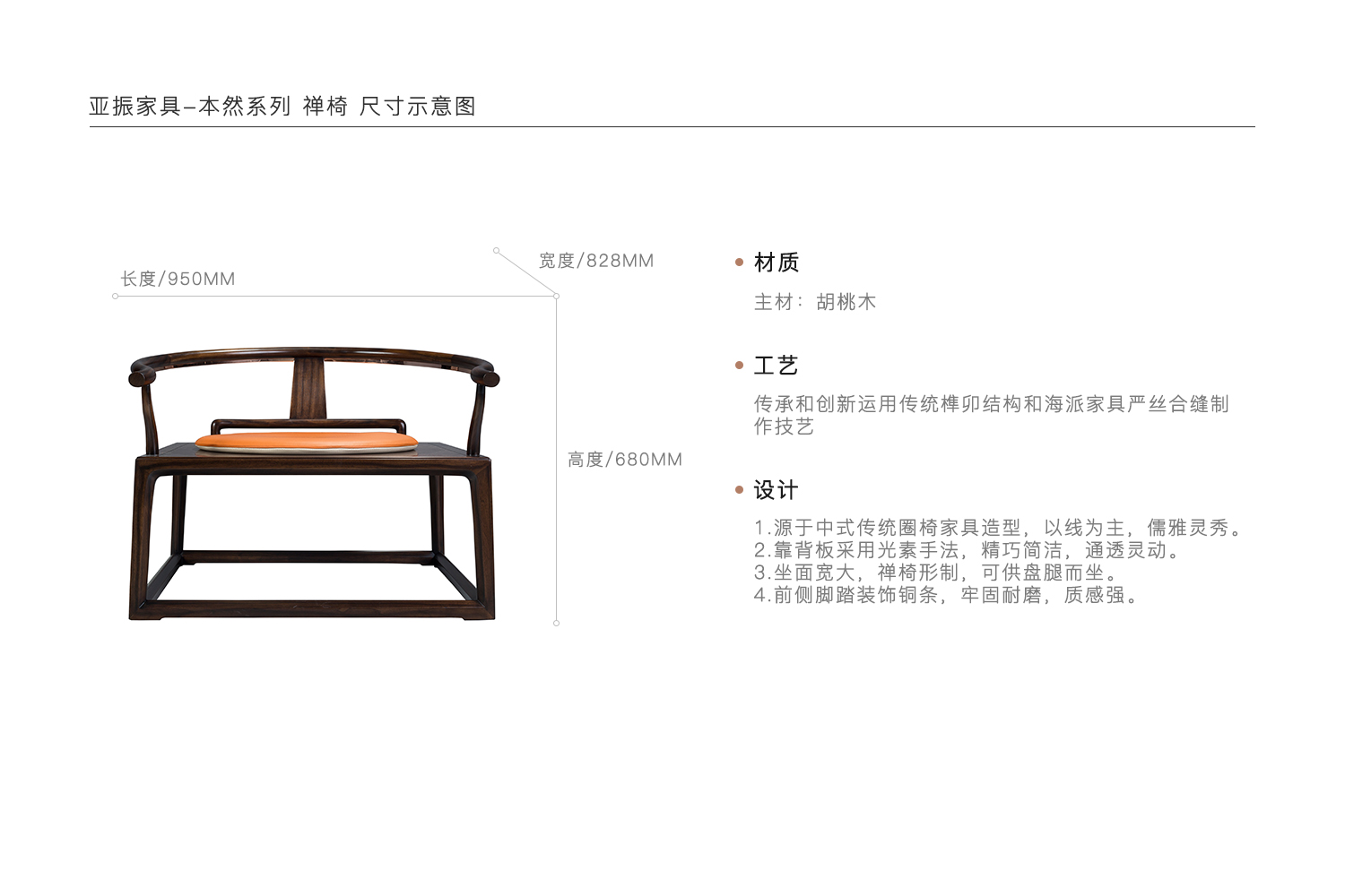 1.源于中式传统圈椅家具造型,以线为主,儒雅灵秀。 2.靠背板采用光素手法,精巧简洁,通透灵动。 3.坐面宽大,禅椅形制,可供盘腿而坐。 4.前侧脚踏装饰铜条,牢固耐磨,质感强。