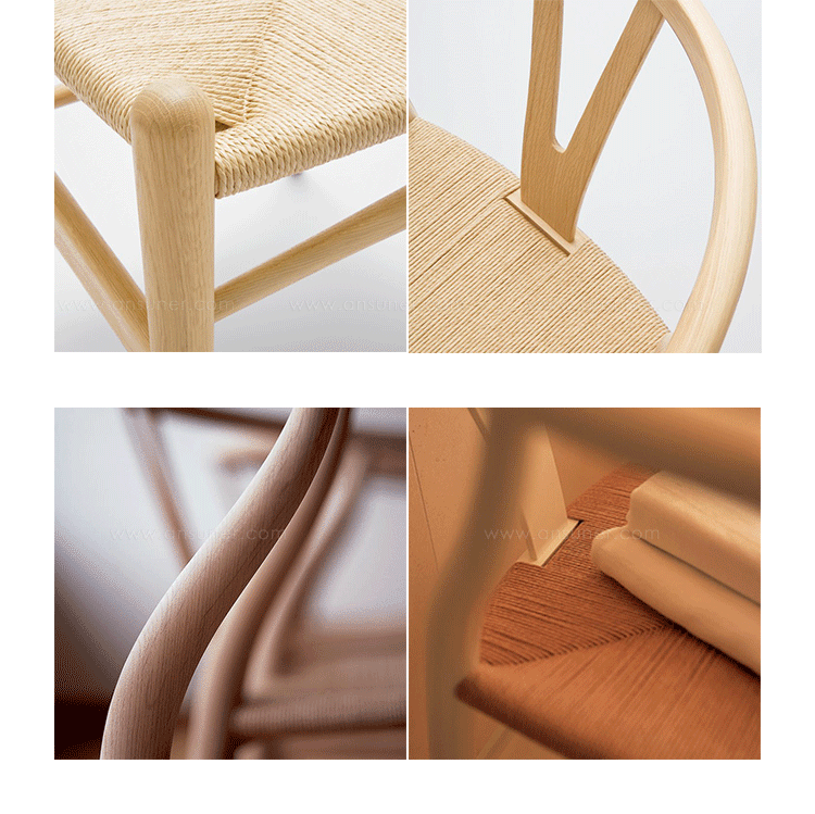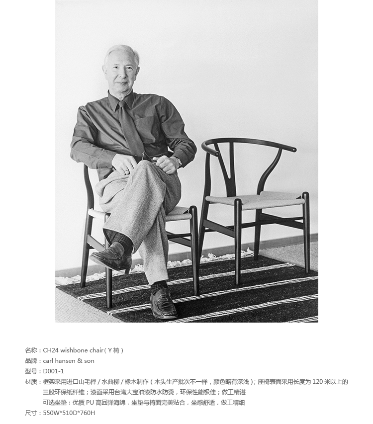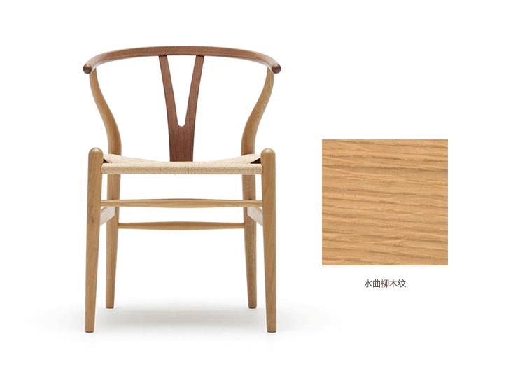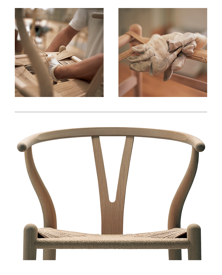 Y椅子是Hans J.Wegner最著名的作品。 它具有重量轻、有吸引力、舒适、中式风格等特点。 该款设计灵感来源于中国传统家具,四平八稳,古色古香,大气自然。上圆下方,浑然天成,深受中国顾客喜欢。Y椅关键在于是工艺与简约的设计,有着清晰的线条。 尽管椅子简约的外观要超过100个步骤进行。除其他事项外,手工编织座垫超过120米的线。 材料有丹麦硬木(橡木,榉木,水曲柳)以及北美硬木(胡桃木,樱桃木)等。外表可漆成各种各样的颜色。 垫子的座位可以添加额外的舒适。
