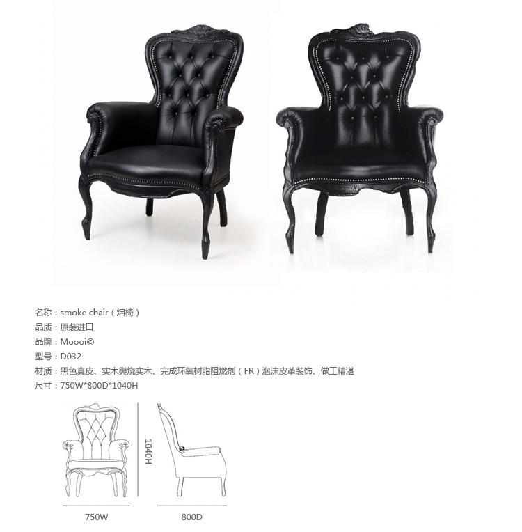 "Pieces of furniture are literally burned,after which they are preserved in a clear epoxy coating.The beauty and character of burned wood is now captured in a long lasting material, creating the strange sensation of sitting on burnt furniture.Maarten Baas is a Dutch designer who graduated from Design Academy Eindhoven in 1996.In 2000 he studied for several months at the Politecnico di Milano. In June 2002 he graduated at the Design Academy a series of burned furniture called "Smoke".Maarten is searching for the boundaries of design,without leaning on the regular"do's and don'ts".The Smoke series includes armchair,dining chair and chandelier. Each item from the Smoke series share the unfamiliar and untamed finish that is categorized by fire.Each piece is unique and may differ due to the process used for production.The smoke chair is upholstered in black leather and has a secret repair kit underneath the seat in case of emergencies."