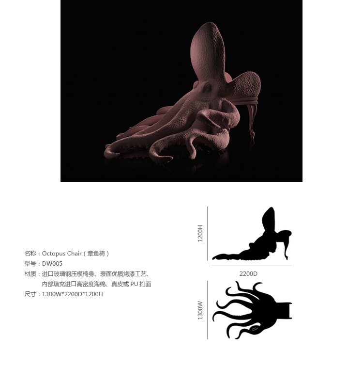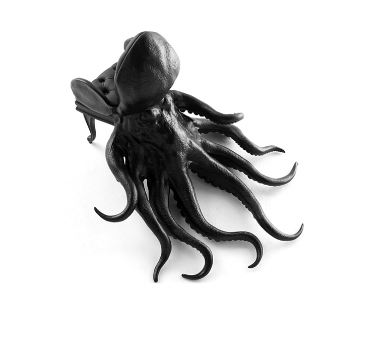 西班牙设计师 Maximo Riera 设计了一组包括章鱼、犀牛、海象、狮子等在内的 15 件动物造型座椅系列皮椅。这个系列的动物椅集合了不同的物种,从哺乳动物到爬行动物,甚至包括昆虫。每个设计都保留了动物的自然活力,同时又准确还原动物的外观特征。这些动物椅的初衷是一种尝试,希望以动物的栖息来反映和捕捉大自然的美,并向我们星球上的整个动物王国致敬。设计师除了表现动物的野性美,也在善意的提醒人们要维持生态的平衡,尤其对濒危物种多加关注,以实现人与自然的相互依赖和谐共存。Octopus Chair(章鱼椅)是动物椅藏品系列的第一件作品,它为作者在未来众多作品中的大胆表现奠定了基础。优雅是该作品最突出的特点。为了忠实表现动物的形体及其运动的自然高雅,必须为其搭建一个内部框架,以支撑其结构和表现良好姿态。正如同系列的其他作品一样,动物是作品中的唯一主角。我们常说人与自然互相依存,和平共处,章鱼椅的设计也很好地诠释了这一理念:它讲求动物与人的和谐,两者相互平等,谁都不需要依赖另一方。章鱼在这里不是装饰;它正如坐在上面的人一样,是椅子内在固有的本质。因此,章鱼椅完美地有体现了动物、椅子和人之间作为一个不可分割的整体所呈现出的一种奇特感觉。