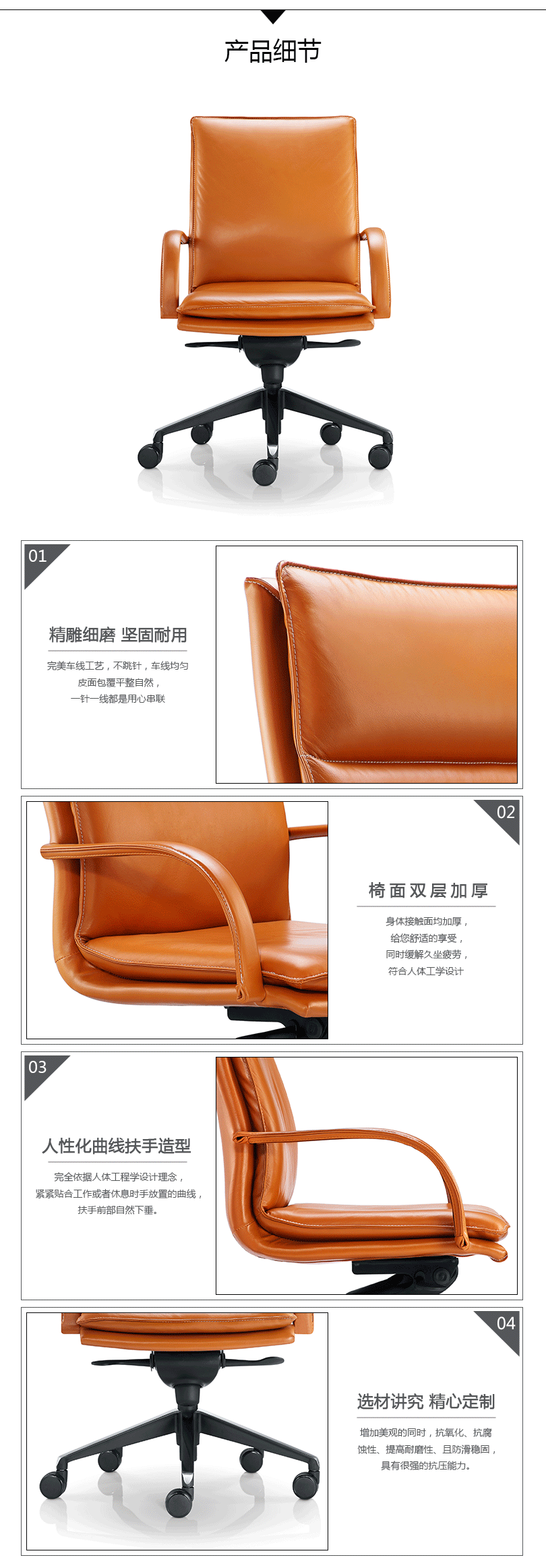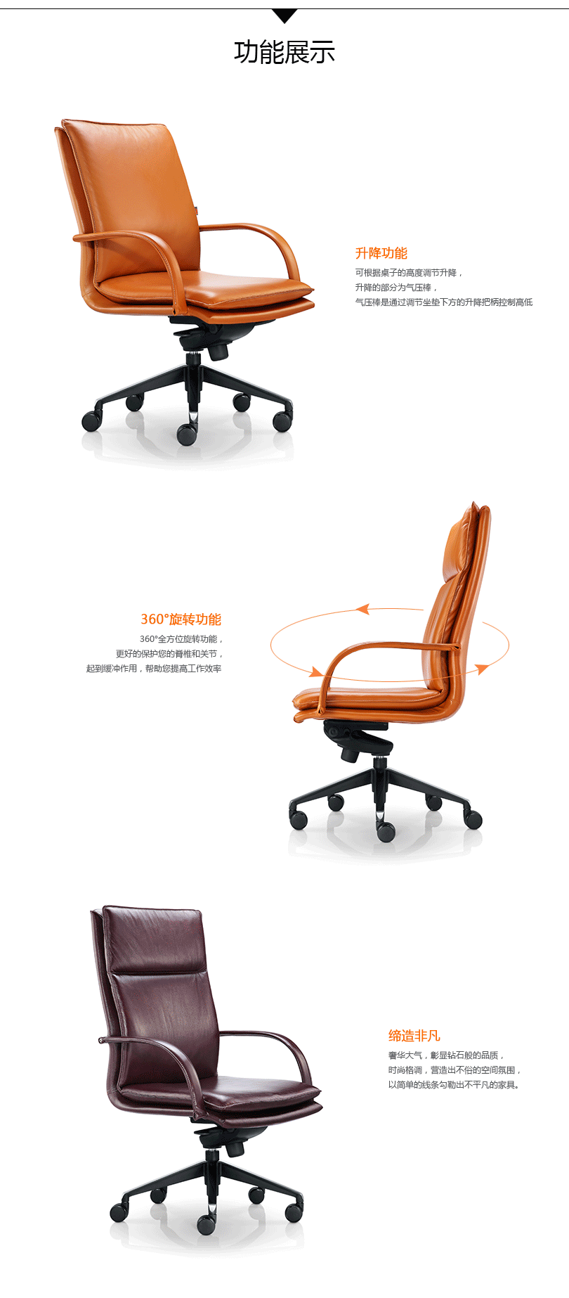奢华大气,彰显钻石般的品质,时尚格调,营造出不俗的空间氛围,以简单的线条勾勒出不平凡的家具。360°全方位旋转功能,更好的保护您的脊椎和关节,起到缓冲作用,帮助您提高工作效率。