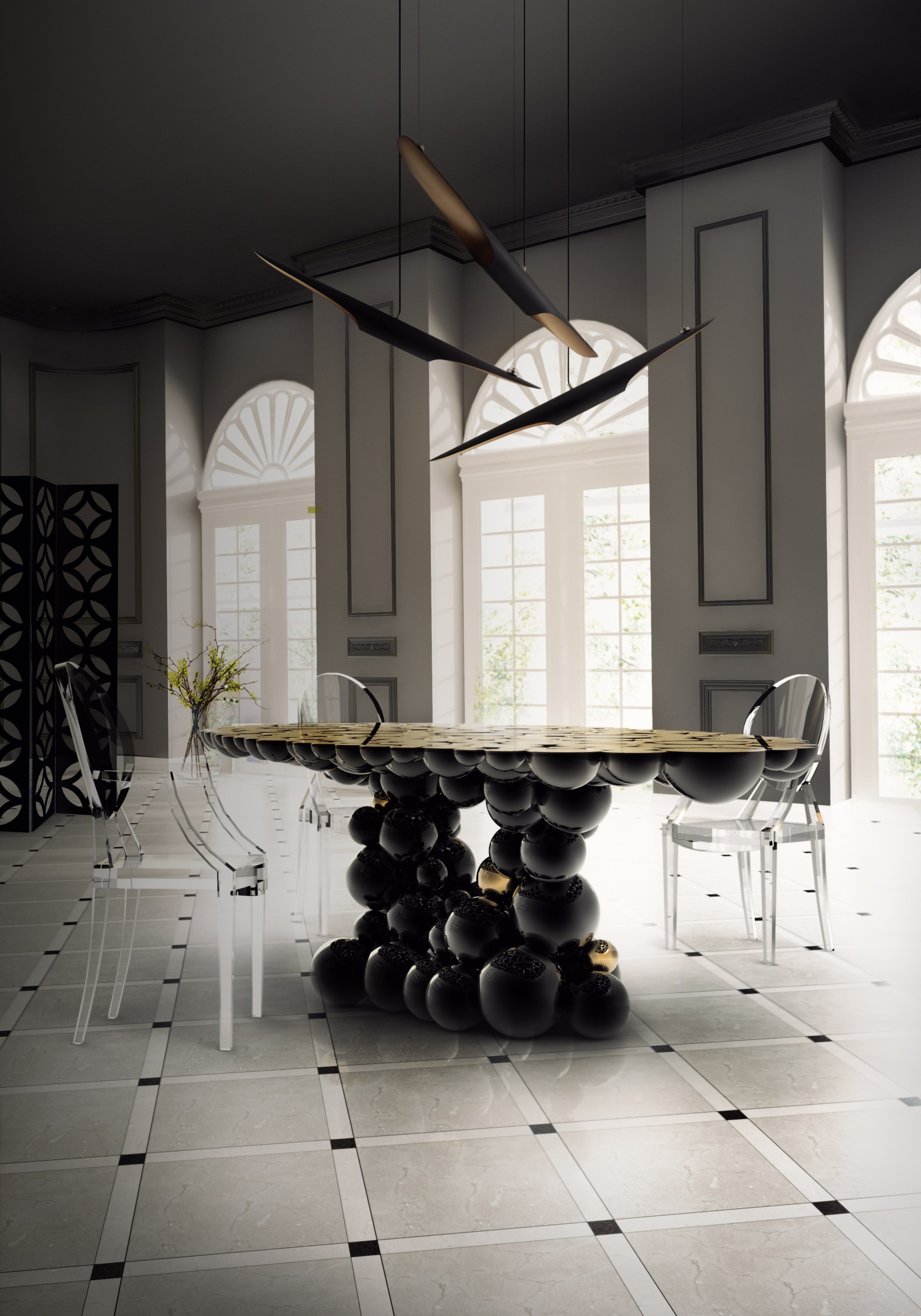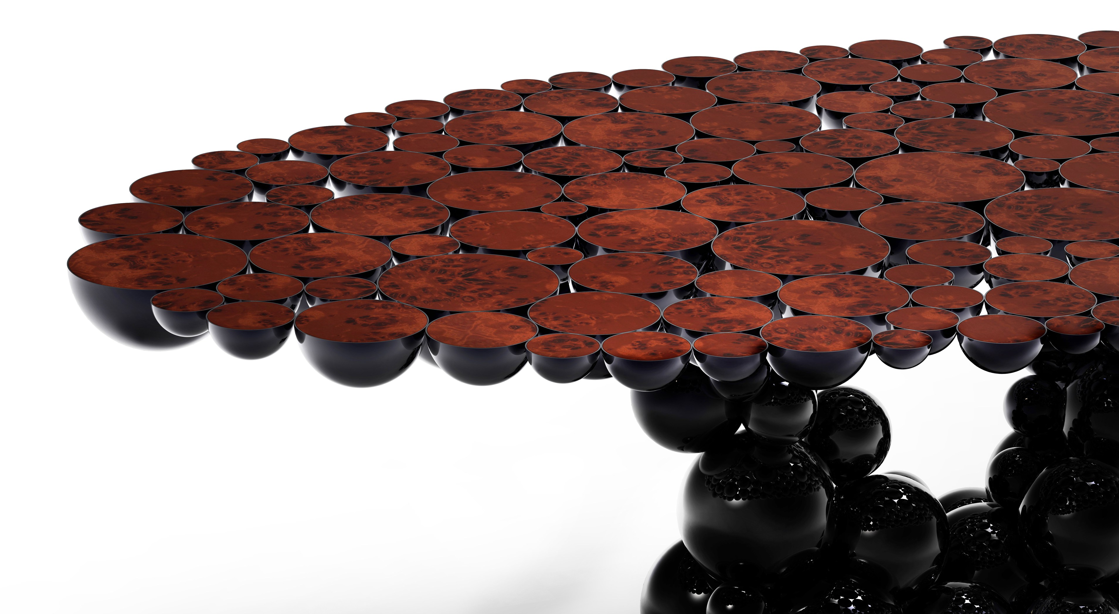 We are still working hard on new challenges for artisans and designers; new techniques, materials and concepts are still being tested now it’s a “MOMENTUM”. Newton is our truly moment of inspiration, a table completed by spheres and semi spheres that joined together complete this dining table with this exquisite look. Inspired in Newton’s law of gravity, we were looking for an object capable to reflect the sphere attraction as they were joined with their mass, force and energy. This table is ideal for 8 to 10 people who will be amazed when gracing this masterpiece at your home. Techniques as casting, lacquering or varnishing, are used in this table, with materials as myrtle burl veneer, walnut root veneer and aluminum. This table has three different versions and all of them present amazing different combinations.