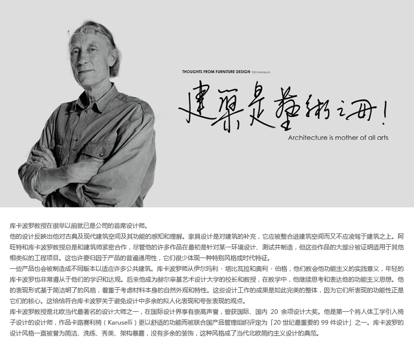 该系列始于库卡波罗1991年为芬兰赫尔辛基新歌剧院的专门设计,简洁、舒适、洗练、高雅,充分体现了现代北欧设计的特点。它有着强烈的个性和近乎数学般的精确造型,人体工学质量是借助于不同科学试验模型进行研究的,在结构、功能与审美形式上的发展与协调是近乎完美的。