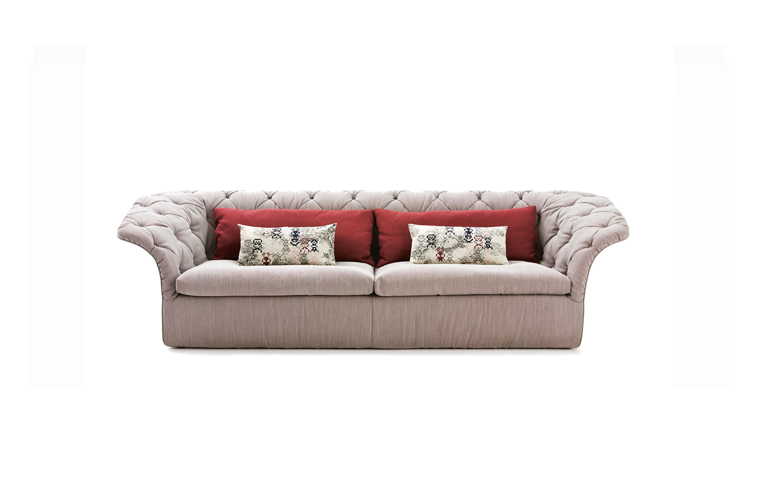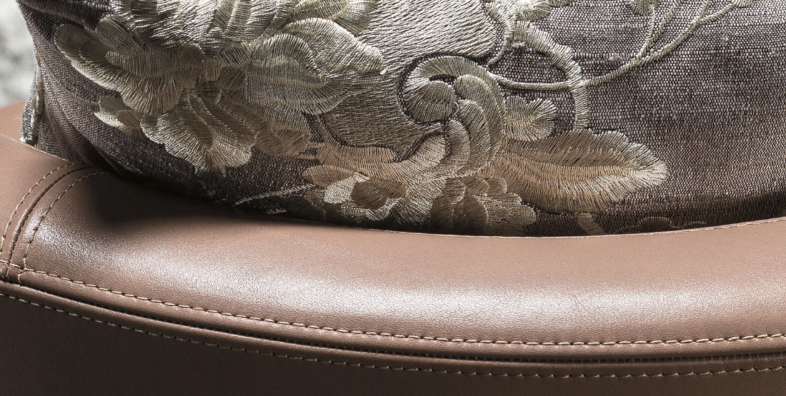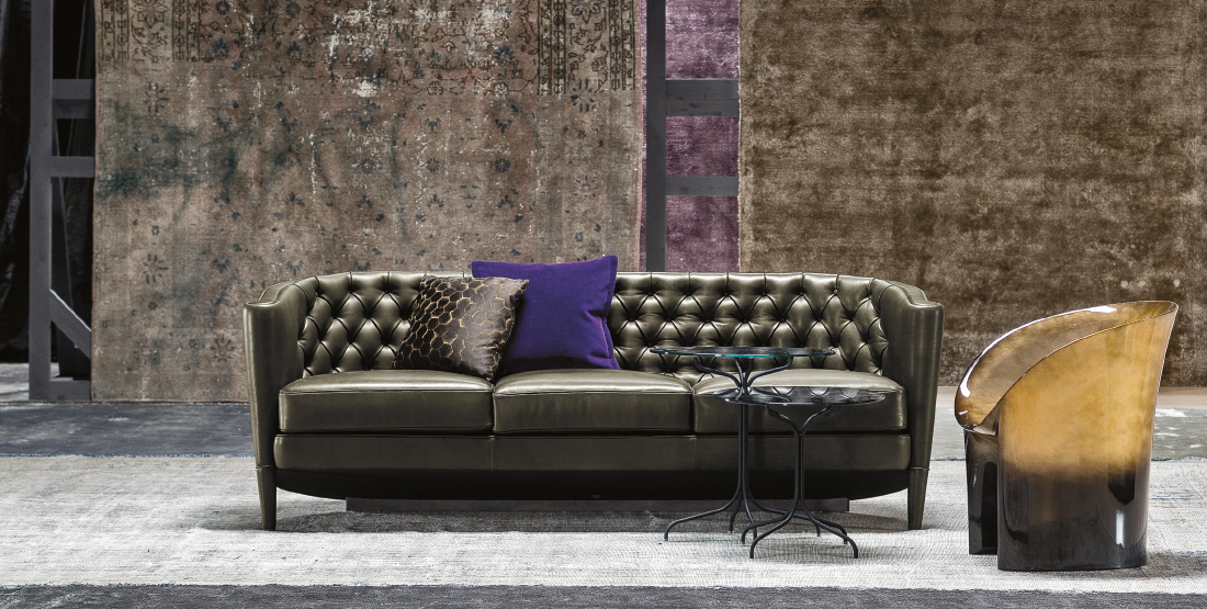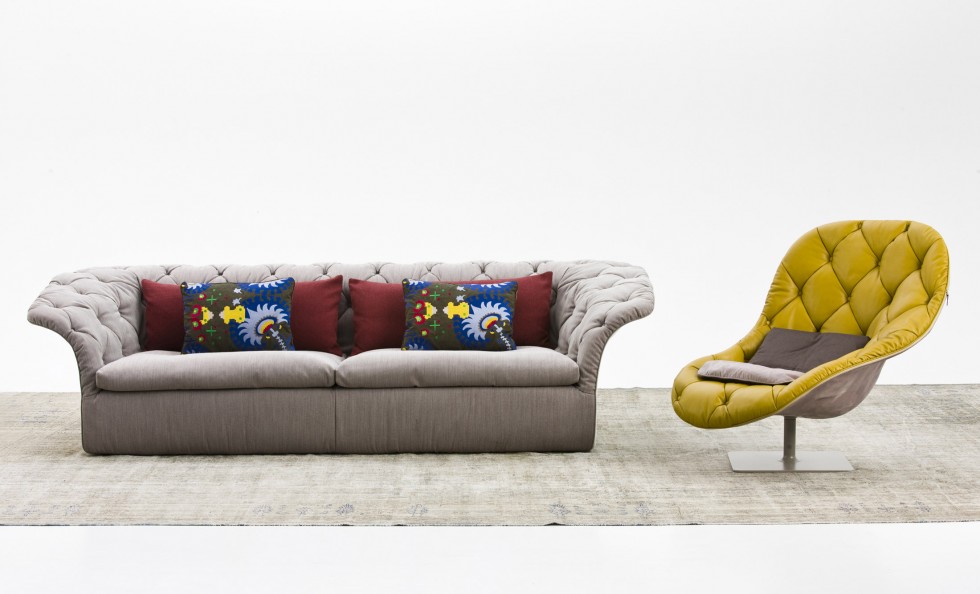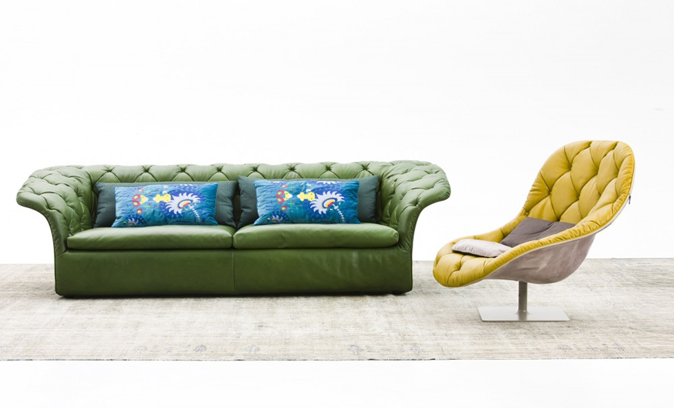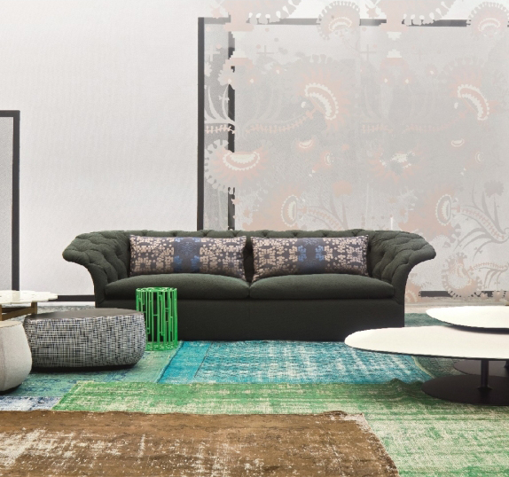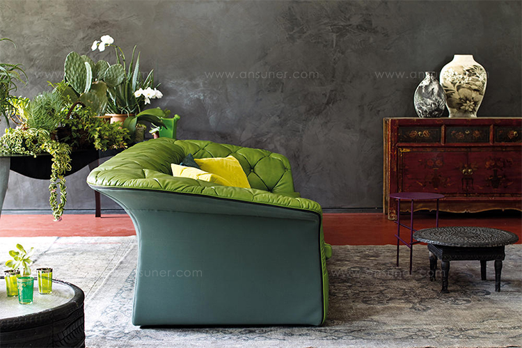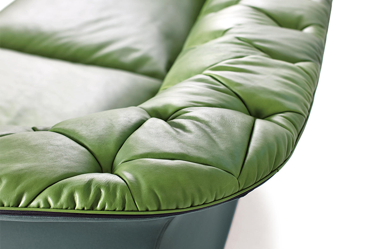 帕特丽夏·厄奎奥拉采用的是一种全新的旋转方式,革命性地改变了这一概念,她设计了一系列的产品,这些产品的形状看起来是液态的,就好像它们在框架上融化一样,以制造柔软的,舒适的,几乎随意的线条,这些布料和皮革都用按钉固定在外壳上。这些碎片似乎披着披在肩上的披巾,座椅上有各种重叠的软垫:几乎是对其覆盖层的设计、层叠的皮革和其他材料、颜色和面料类型的关注。这是一种奢侈的拼贴,当它穿过时,就会给人一种游牧式的全球精神。