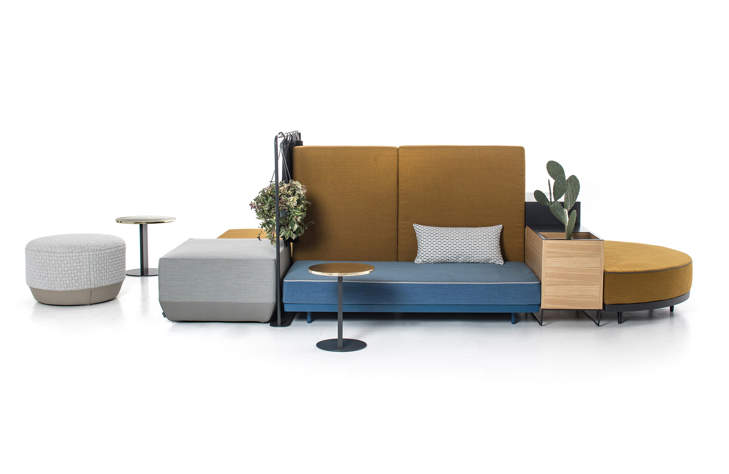 设计相互作用,轨迹控制空间。比基尼是一种风景,它是时代的产物,是它所代表的社会。无论是在等候区还是在家中使用,座位系统是绝对灵活的,因为不需要空间的布局和座位组件的排列。这些组件在外观和功能上各不相同,因此,它们可以在任何设置中使用。凳子、桌子、衣架、容器、架子、屏风、工作台、座椅:每一个元素都结合在一起,创造互动和交流。多种功能和含义的结合意味着沙发作为看电视的家具或简单的休息场所的概念发生了革命性的变化,使它成为互动的核心。