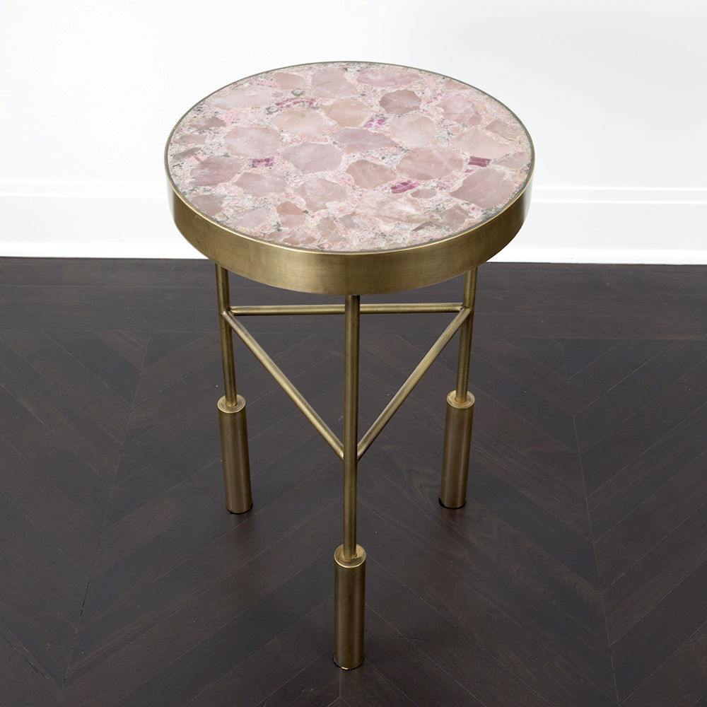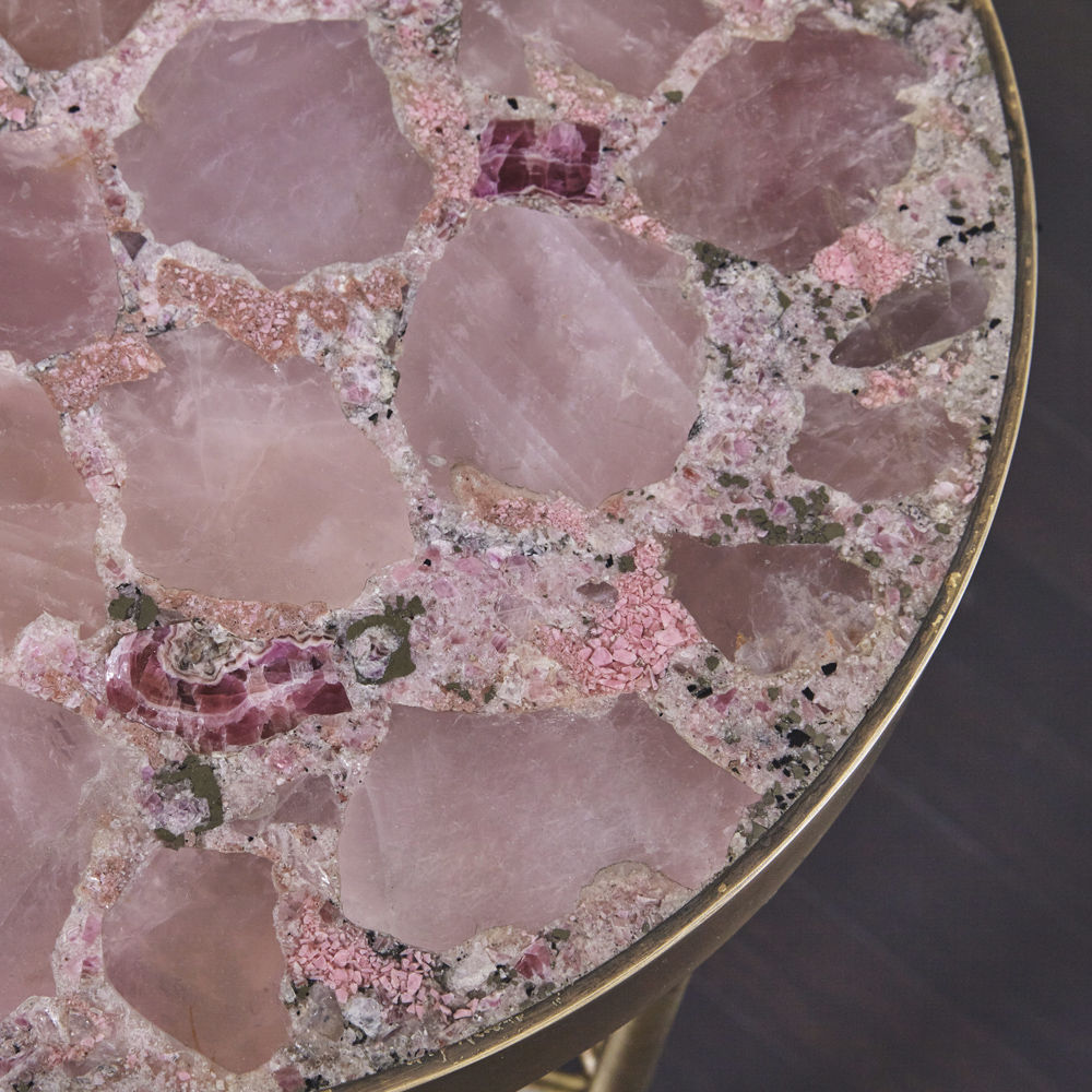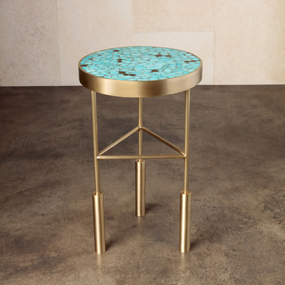 Sedona Side Table(塞多纳边几)有一系列镶嵌和抛光的半宝石,如玫瑰石英的菱锰矿,以及抛光黄铜框架的绿松石云母板岩。 每件作品都是独一无二。