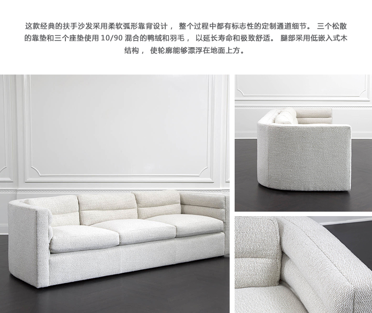 这款经典的扶手沙发采用柔软弧形靠背设计,整个过程中都有标志性的定制通道细节。 三个松散的靠垫和三个座垫使用10/90混合的鸭绒和羽毛,以延长寿命和极致舒适。 腿部采用低嵌入式木结构,使轮廓能够漂浮在地面上方。 硬木框架采用双向榫钉,配有8向手动弹簧,经久耐用,性能卓越。