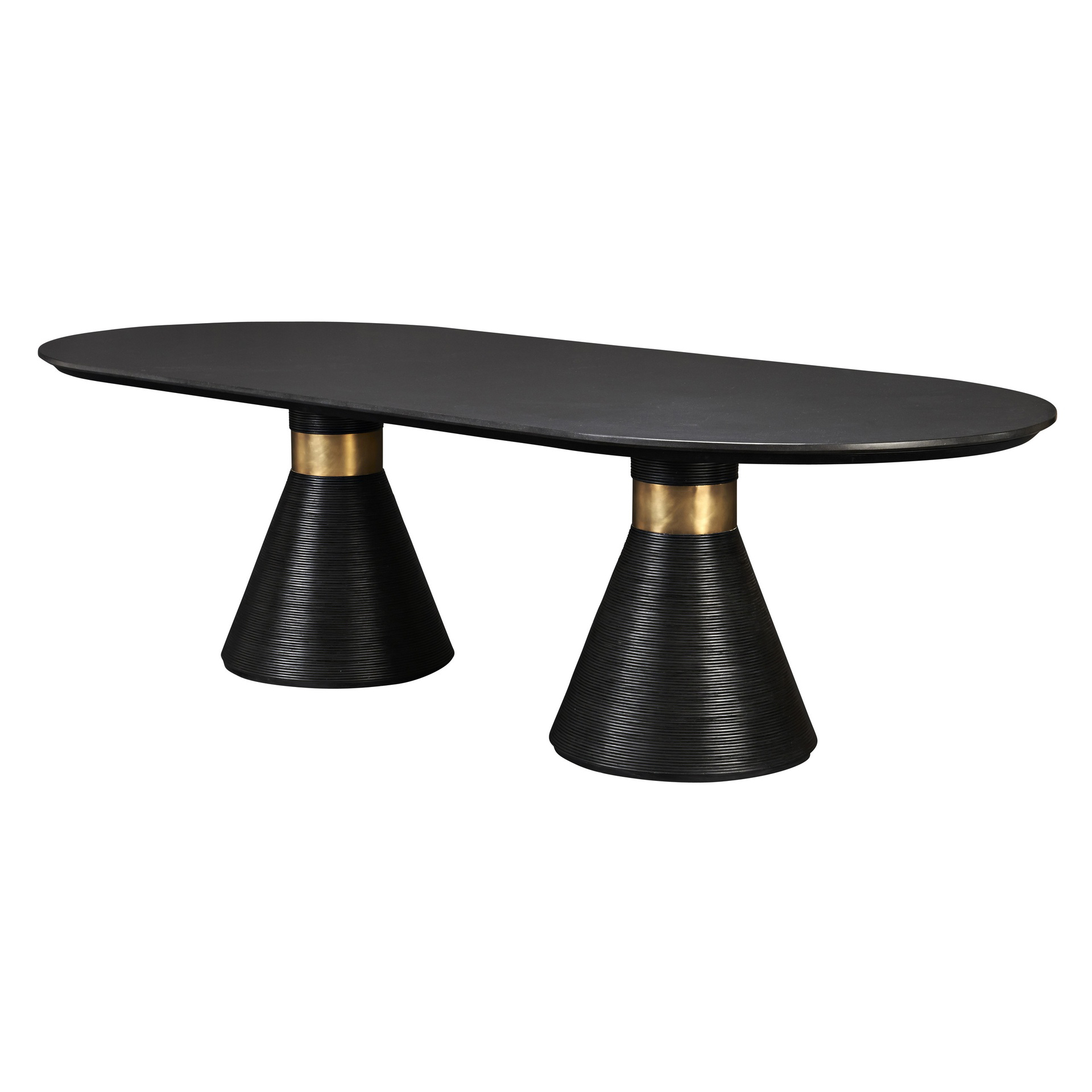 这个戏剧性的餐桌充满了凯利对混合材料和雕塑轮廓的热爱。 赛道形状的顶部是在“leathered”板岩中执行的,具有柔软的略微缓和的斜边。 圆锥形双人底座采用罗纹木材制成,饰有抛光黄铜,营造出优雅气息。