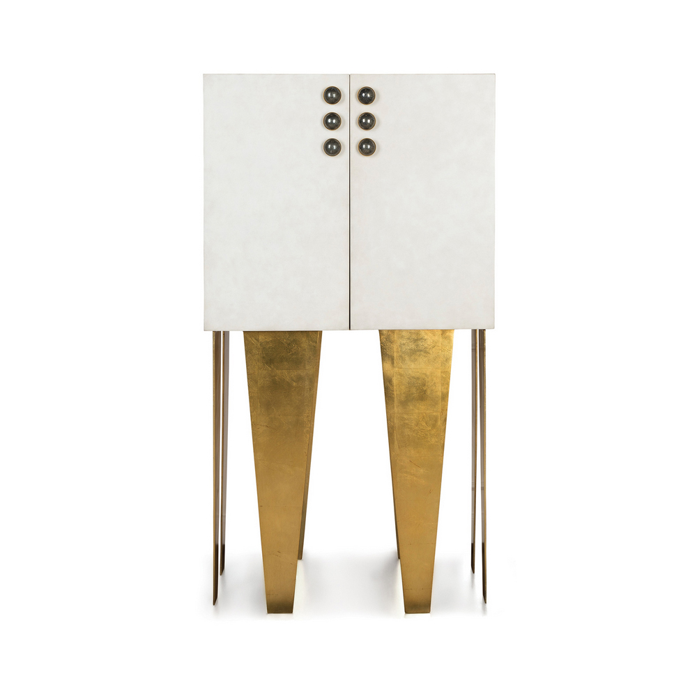 格里菲斯柜子装饰有手工挑选的半月形黄铁矿石,镶嵌在优雅的青铜框架中。 黑色或抛光的青铜色饰面交替出现,凸显了凯莉对混合金属色彩和原始自然细节的亲和力。 钢底座,羊皮纸外包装和天然胡桃木内部抽屉。