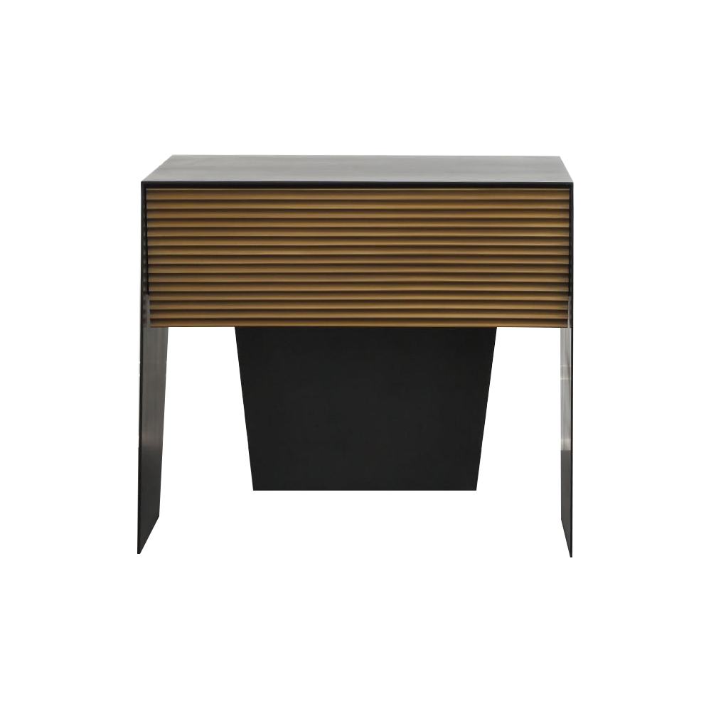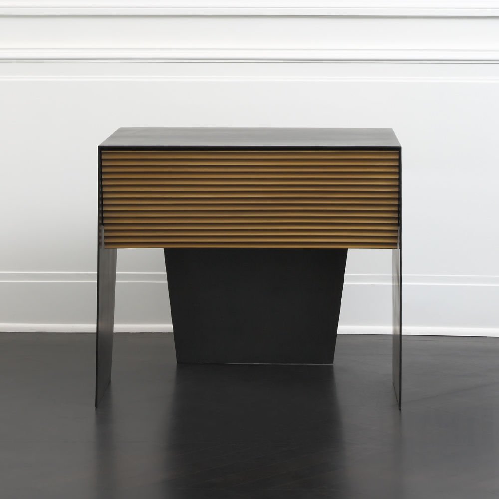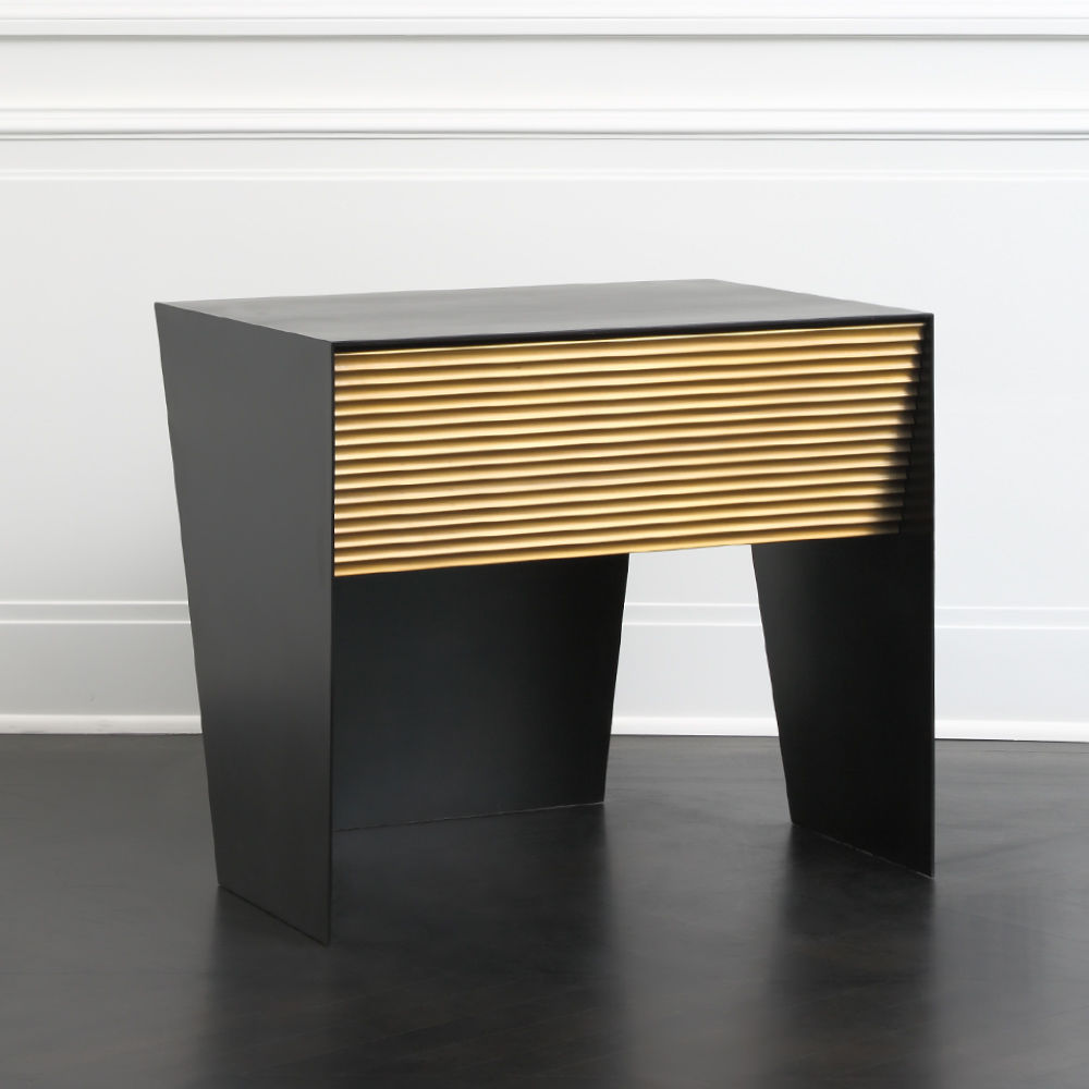 Gallant是一款令人难以置信的现代时尚床头柜,采用坚固的不锈钢材料制成,带有丰富的黑色铜绿。 黑檀木胡桃木单抽屉采用亚麻衬里,柔软贴身滑动,精致扇形青铜抽屉正面。 这款床头柜的强劲线条和对比金属平面赋予它优雅的阳刚之气。