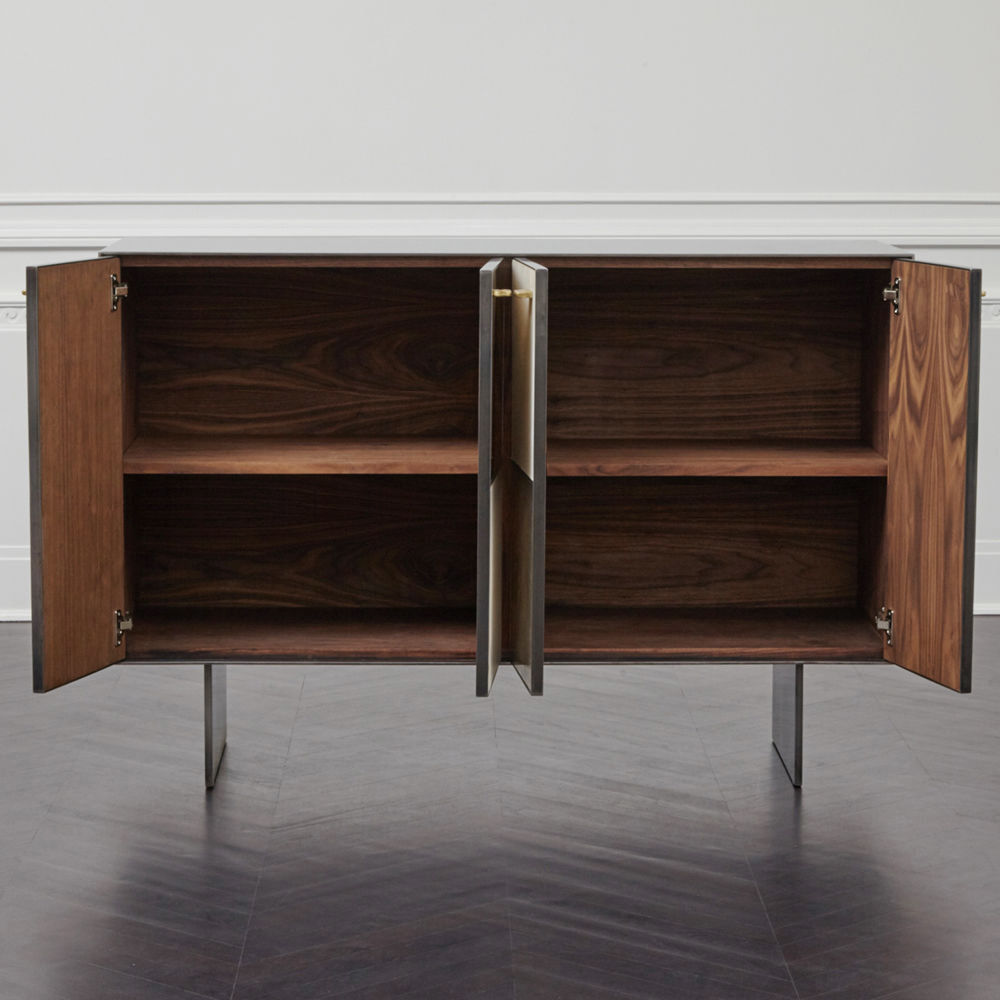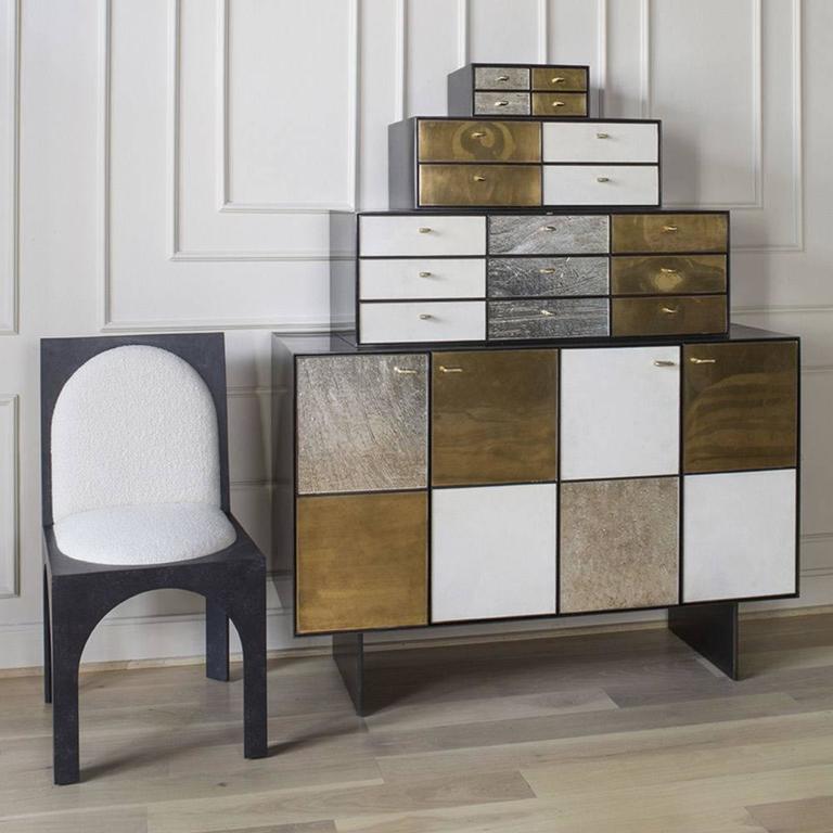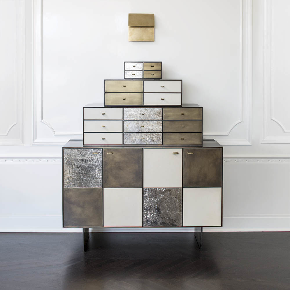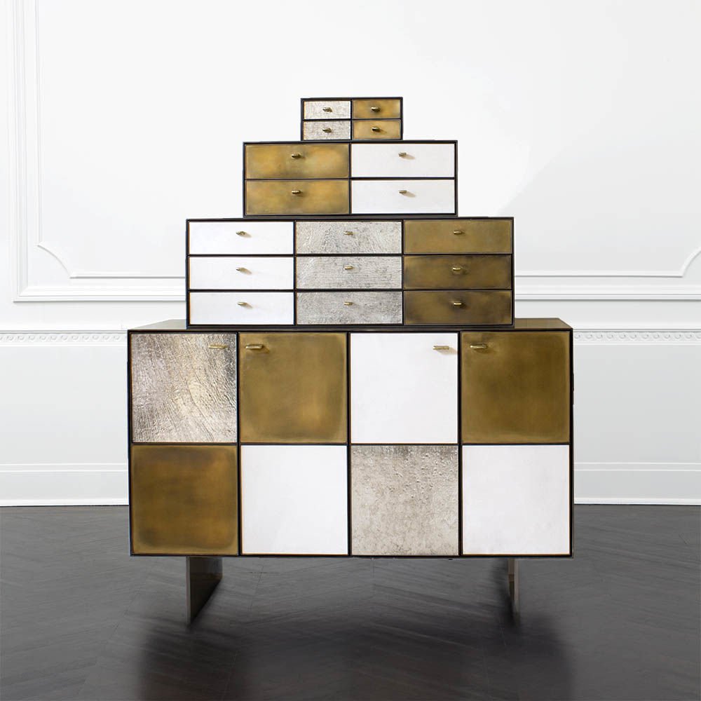Huntley Cabinet(亨特利柜)是由黑色不锈钢机身和美丽的美国胡桃木内饰组成。在操作台部分的四扇门后面,一个可移动的内部搁架显露出来,而堆叠的金字塔形状以传统燕尾滑动抽屉为特色。 白色羊皮纸,手工制作的透明种子玻璃,古董镜子和抛光青铜,抽屉和门前面交替,全部装饰有手工雕刻的拉链。