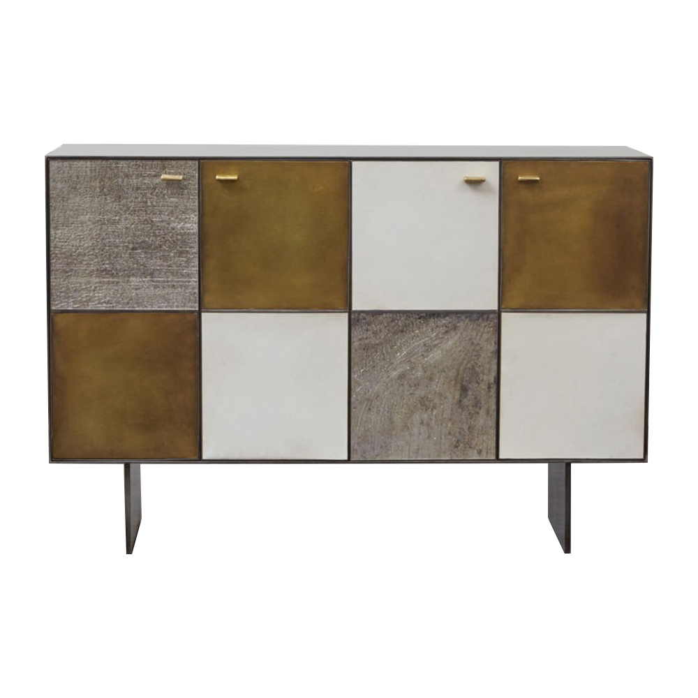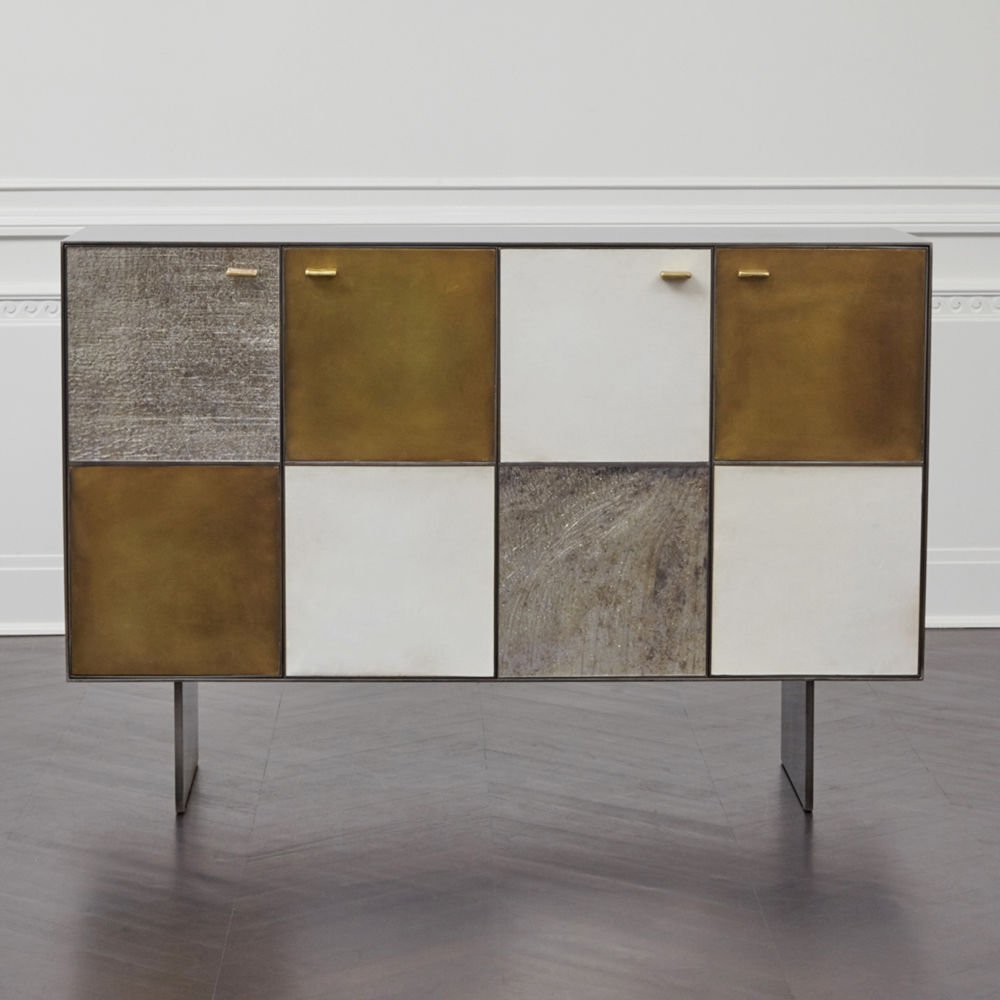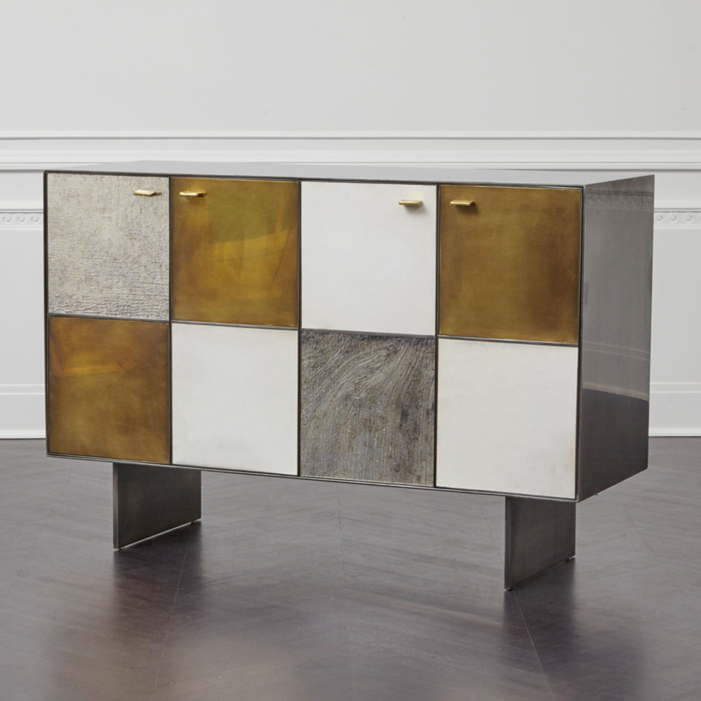 Huntley Cabinet(亨特利柜)是由黑色不锈钢机身和美丽的美国胡桃木内饰组成。在操作台部分的四扇门后面,一个可移动的内部搁架显露出来,而堆叠的金字塔形状以传统燕尾滑动抽屉为特色。 白色羊皮纸,手工制作的透明种子玻璃,古董镜子和抛光青铜,抽屉和门前面交替,全部装饰有手工雕刻的拉链。