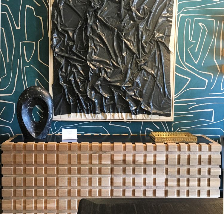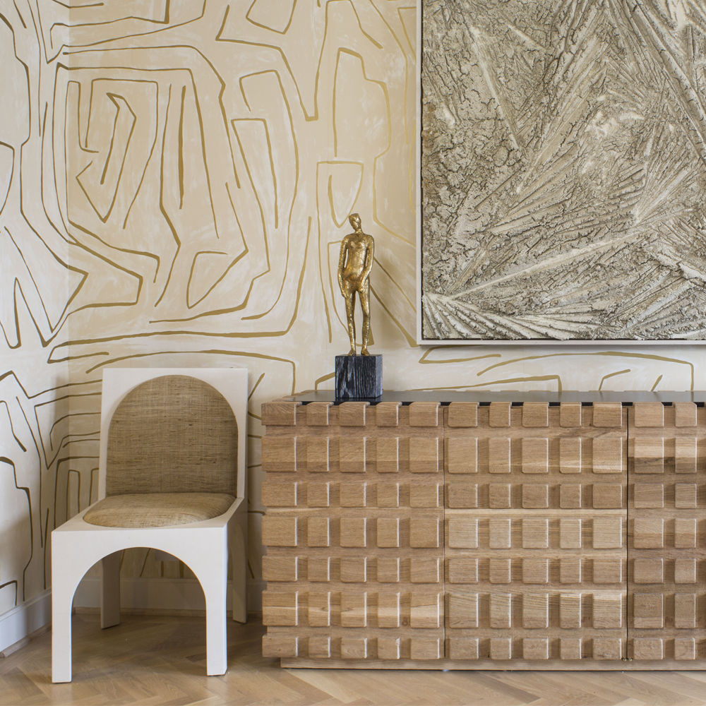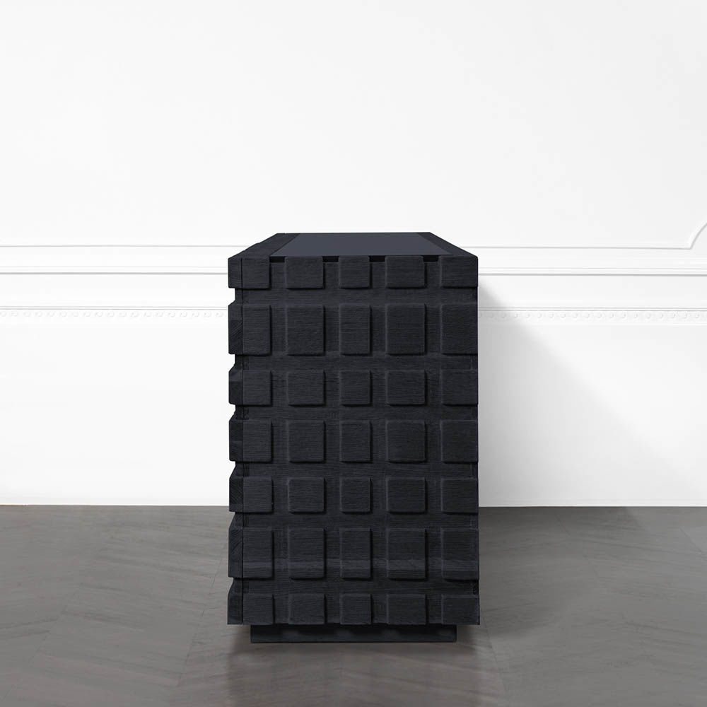 太平洋书柜的几何正面和侧面,由坚固的四分之一锯橡木雕刻而成,为这款巨大的低控制台带来了坚固的精致。 顶部镶嵌的金属丝拉丝大理石增加了整体的原始精致感。