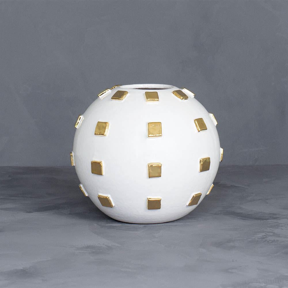 Chalet花瓶手工制作于意大利,配有22k金签名。 这款8英寸直径球形花瓶装饰有金色釉面瓷砖。 Chalet花瓶适合桌面使用,为任何房间增添功能性和魅力。