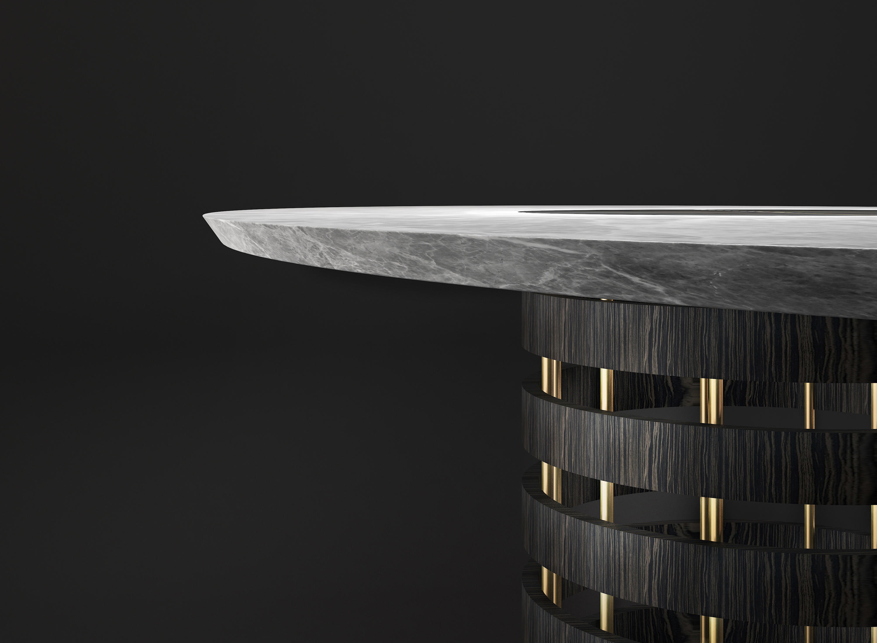 华丽华丽的桌子;木质结构支撑着椭圆形的灰色大理石桌面。同样的装饰让人想起顶部的图案,薄薄的黄铜条交织在一起,呈现出不同寻常的优雅。实体空间和空洞空间的交替与顶部的坚固性相矛盾,确实带来了意想不到的轻盈感。