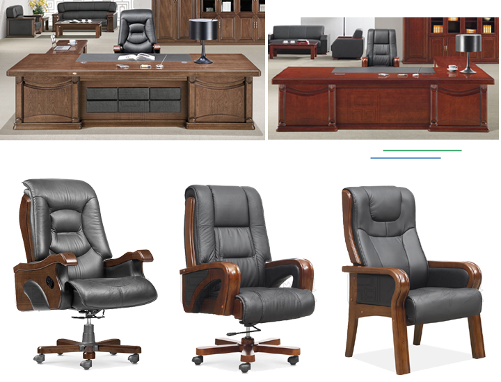 ※ 以上图片是两款类似班台正面展示图,配有拼接侧柜,古典的实木雕花配台面黑色皮革,现代而不失端庄的雅典办公;可配置三插电源孔、网络接口、耳机音频接口、话筒接口、VGA接口,也可根据客户实际需要选择和定做,展现了整洁,整齐的办公环境。 可选择实木颜色,满足更多理想需求。