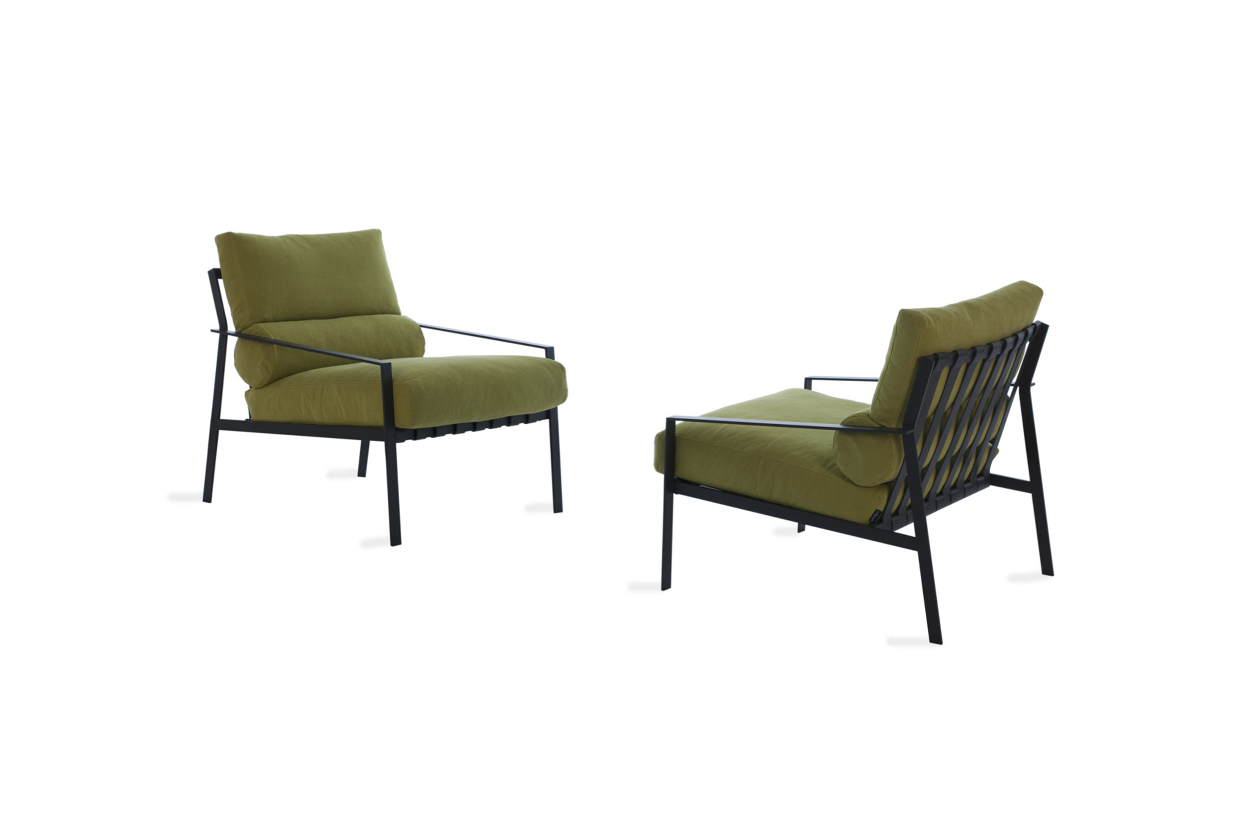 这是一种休闲椅,它的特点是用皮带支撑柔软舒适的垫子。其直线结构是高雅的现代生活方式的一种表达。这一结构有两种形式,一种是云母褐色的涂漆或黑色镀铬金属。