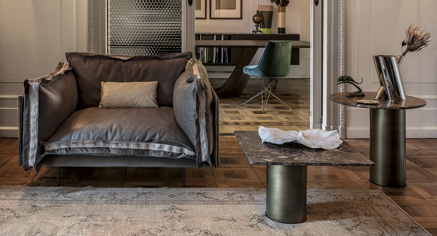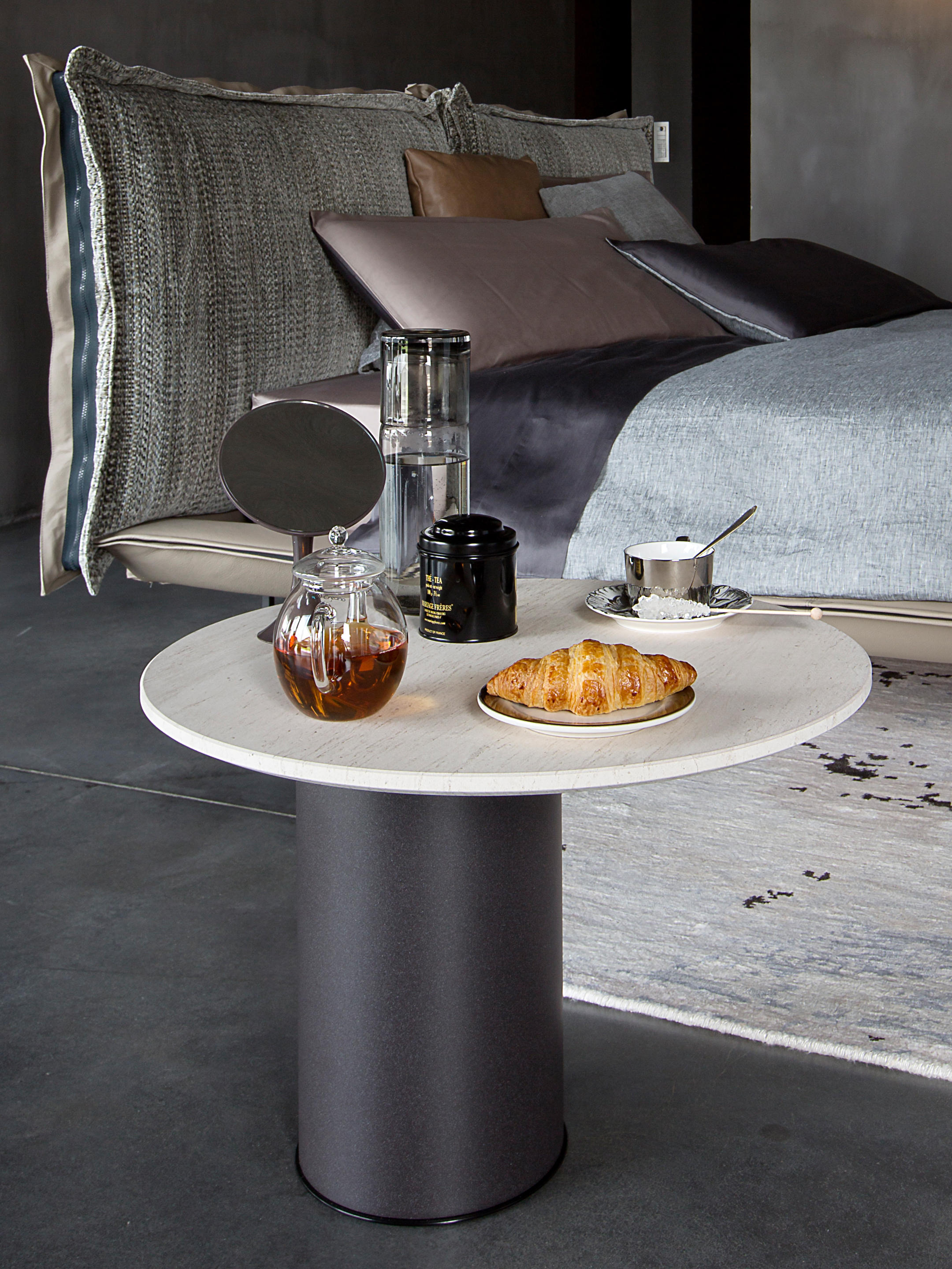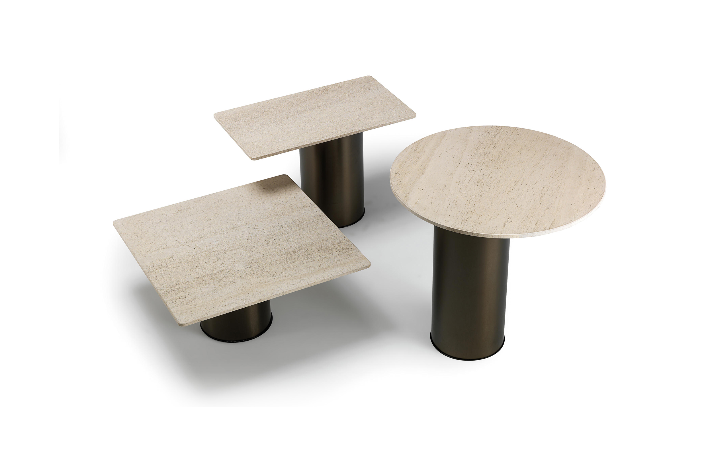 两种不同的材料结合在一个咖啡桌上。Petra咖啡桌被设计为可以当成单独的桌子或作为一套桌子进行使用。底座的设计是偏离桌面中心的,多款桌子因不同的高度搭配在一起创造了一个起伏的桌面效果。桌面有圆形和矩形可供用户进行选择。