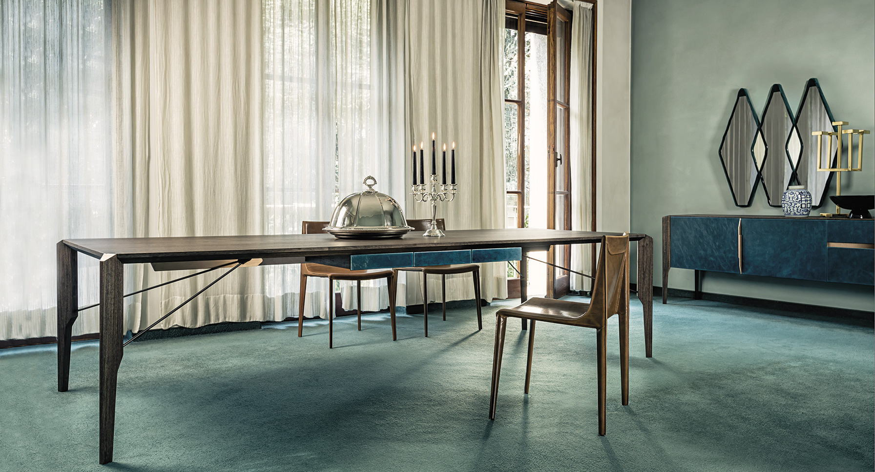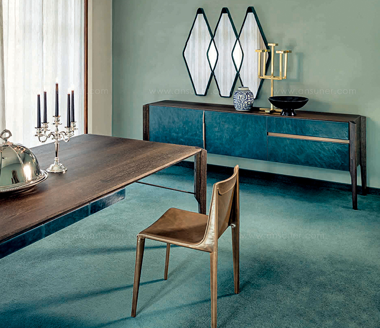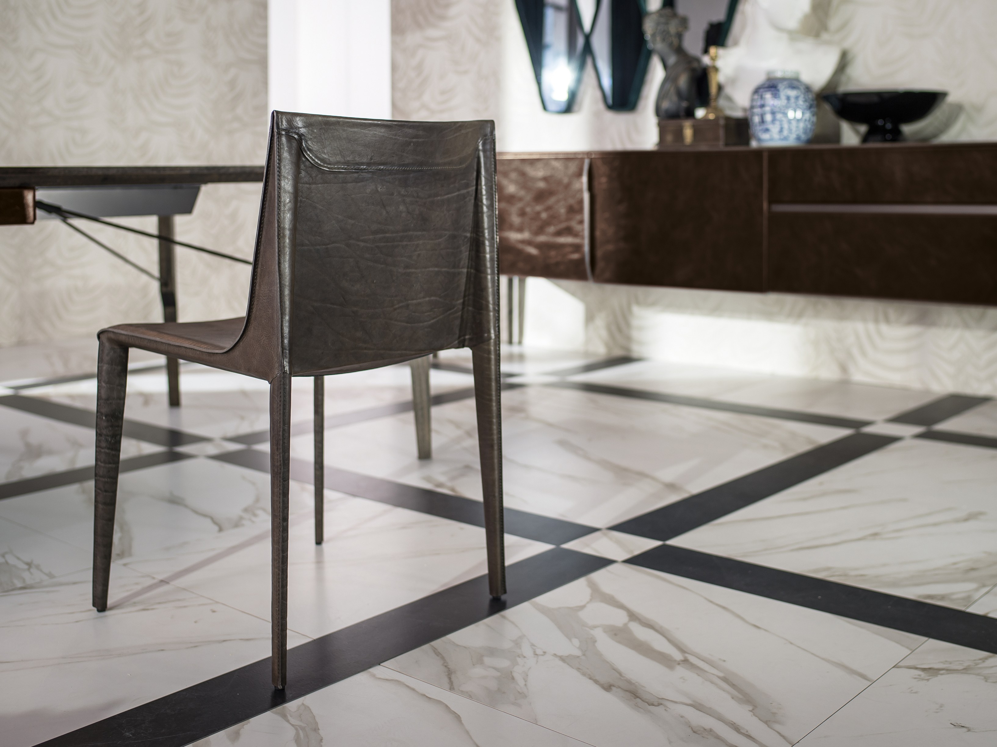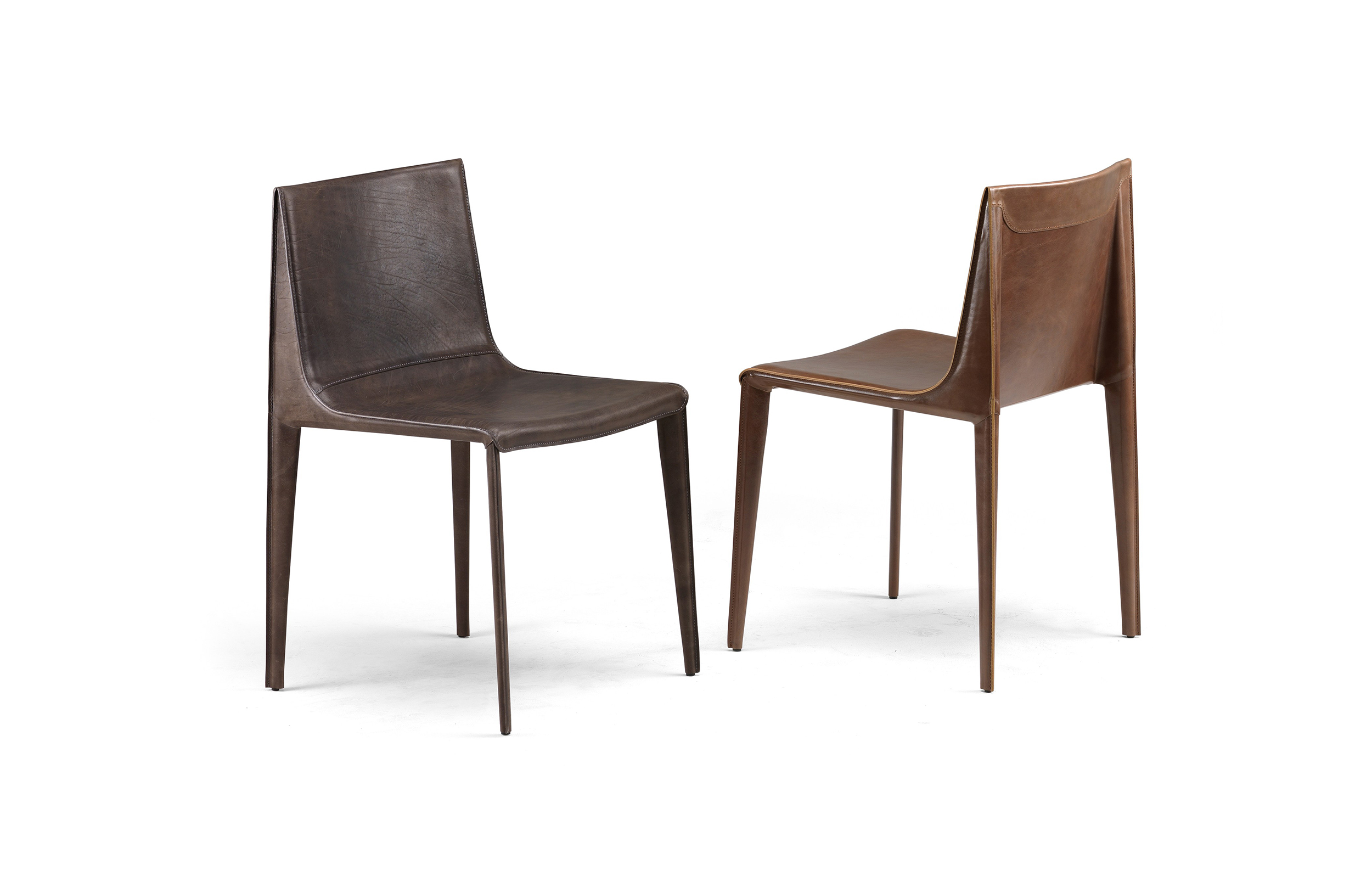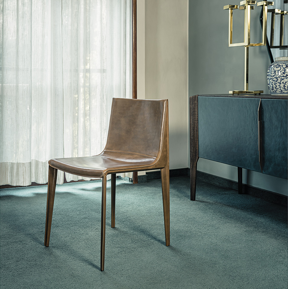 Manzoni & Tapinassi设计的椅子有严格的几何特征,它有一个宽大的座椅和一个较低的靠背,可以用皮革或植物鞣皮革饰面。