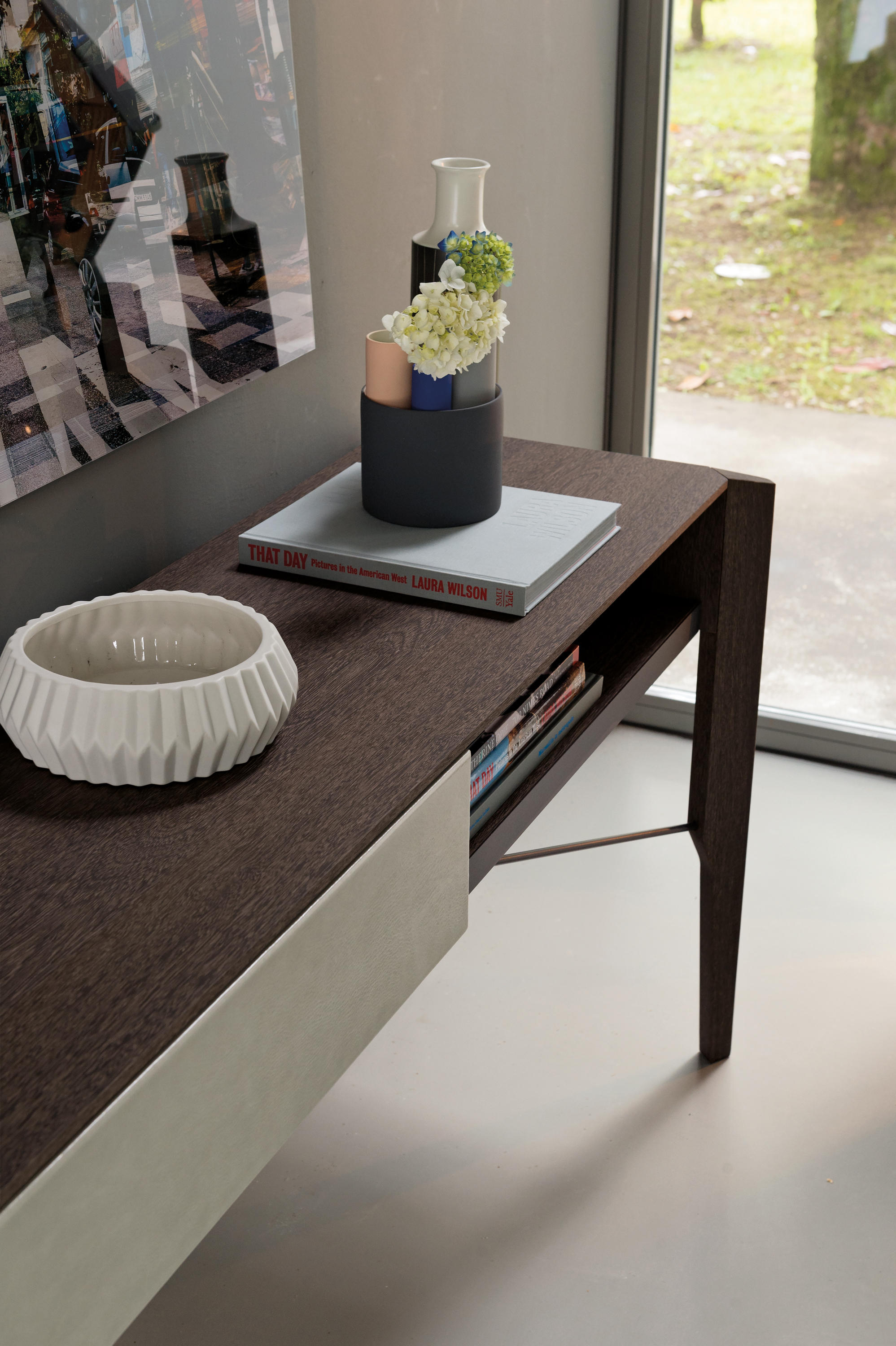 Manzoni & Tapinassi装饰柜的侧板可以在摩卡橡木、卡纳莱托胡桃木或苏皮亚木上选择制作,金属框架由云母褐色或镀锌钛制成。虽然它的结构看起来很薄,却起到了很好的支撑作用。
