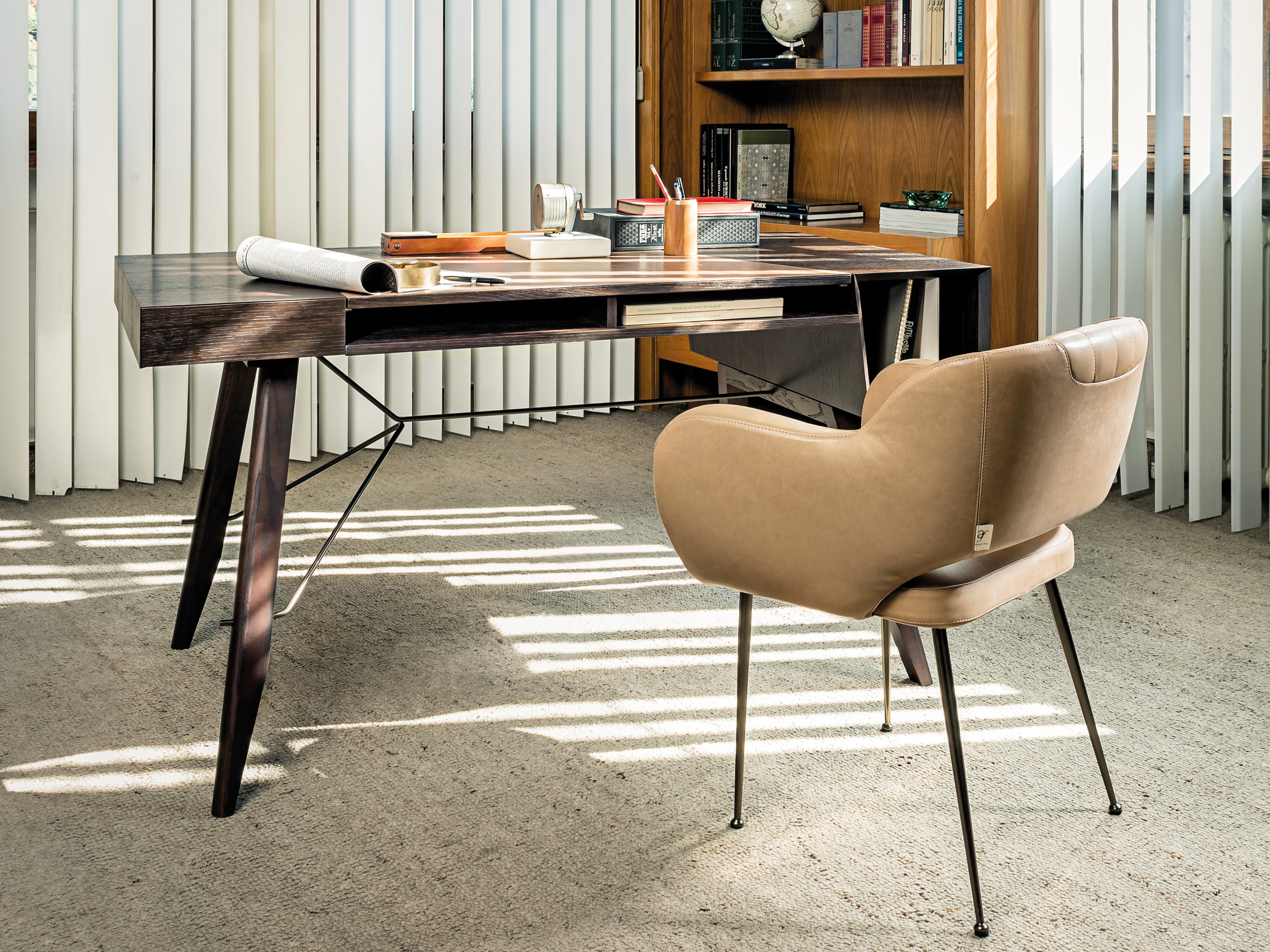 一个线性的、可适应的桌子,桌面配有皮革。这种金属镶嵌的纵横交错的底座让整个作品在纯粹的复古风格中增添了一种现代气息。抽屉的设计赋予了深度和功能,让它不仅是一个工作桌,还可以存放一些私密的文件。
