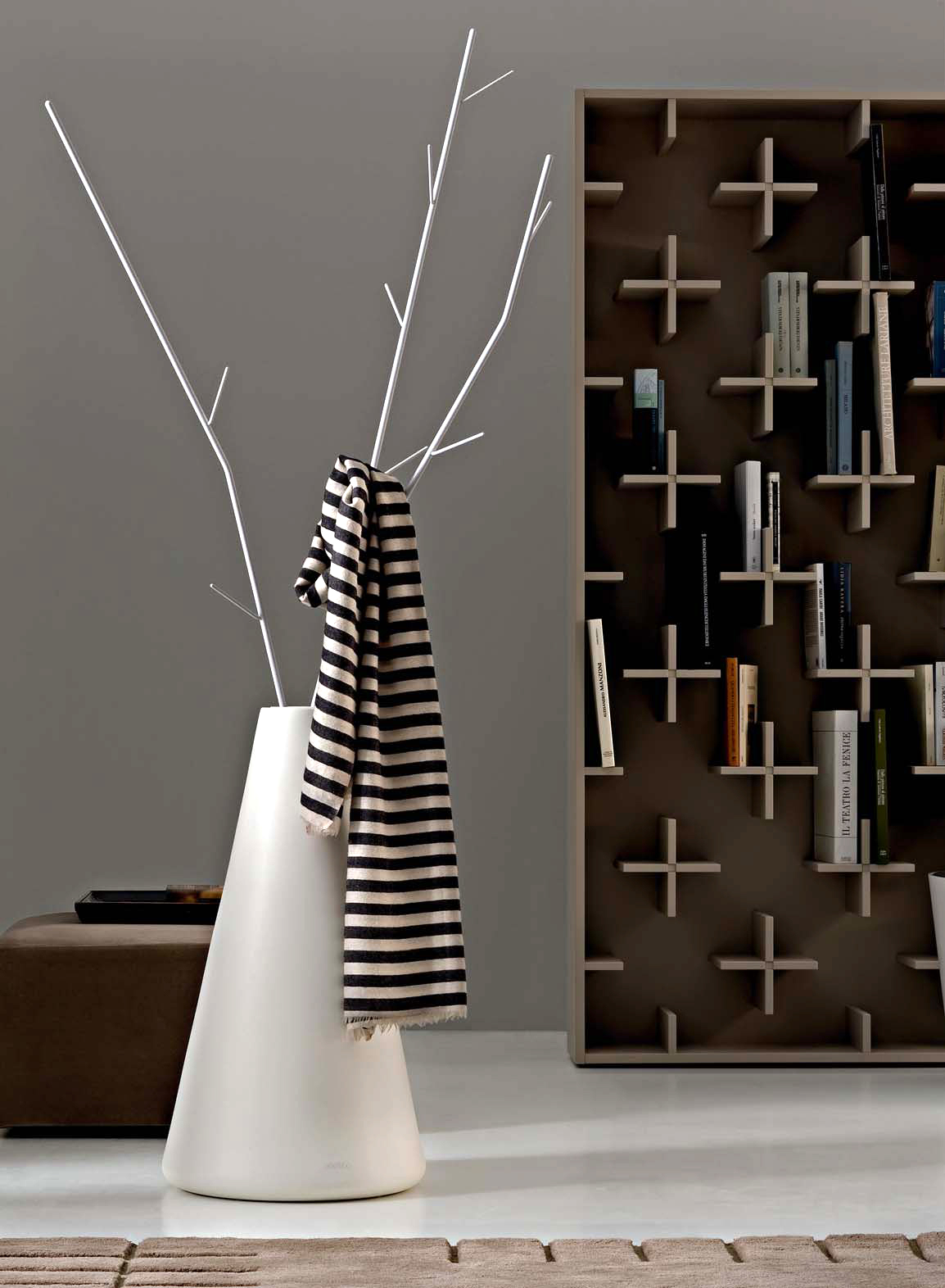 一个简单而优雅的书柜:MDF结构由很多小十字架组成,构成书的支撑。这些十字架看似杂乱无章,但当书被放置在它们上面时,它们从明显的标志变成了一个模糊而又有规律的整体。