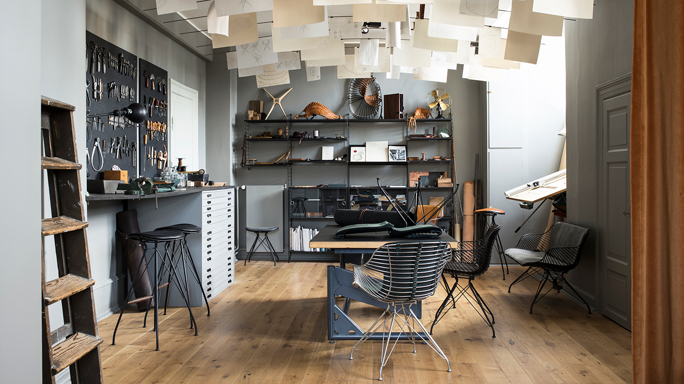 金属丝吧椅由Jasper Overgaard和Christian Dyrman设计。2014年设计的金属丝躺椅是一种更低、更宽、更平放的版本,与铁丝餐椅相比。