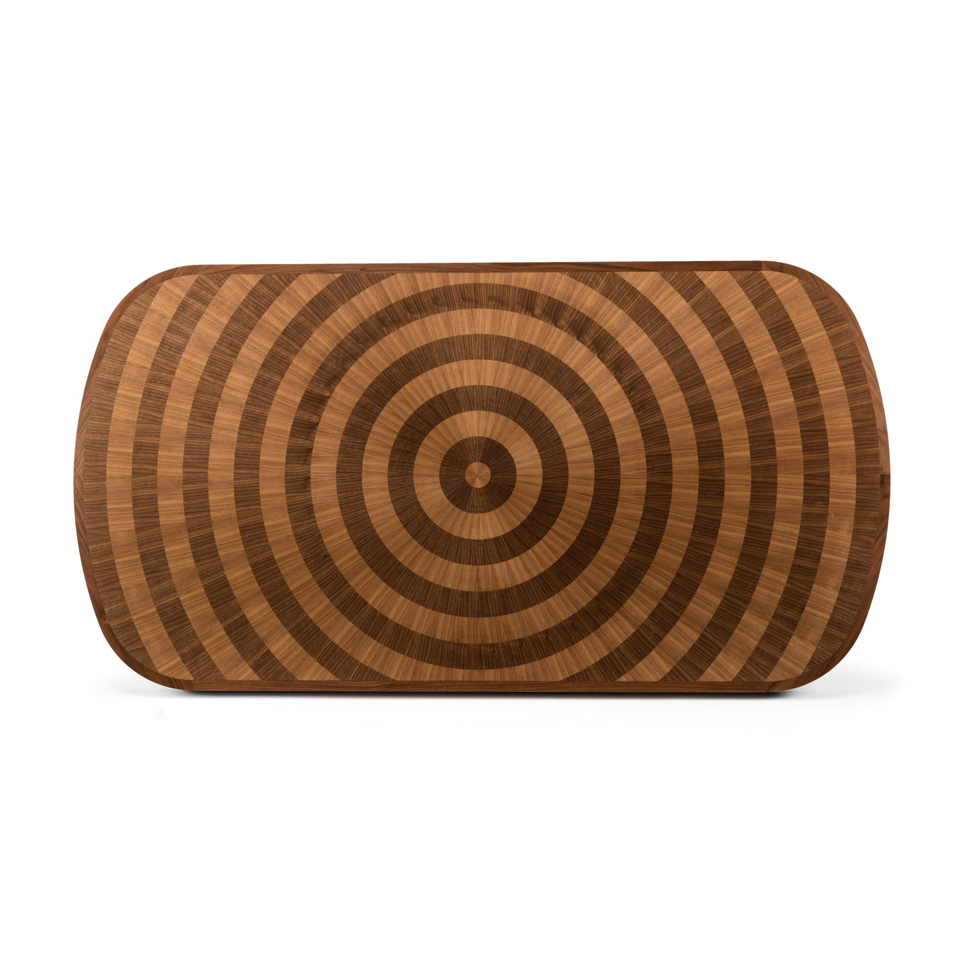 光芒四射的浅色和深色胡桃木饰面突破了我们超凡脱俗的Astral餐桌的表面,它们的生命环仅由坚实的胡桃木装饰和锚固基座限制。