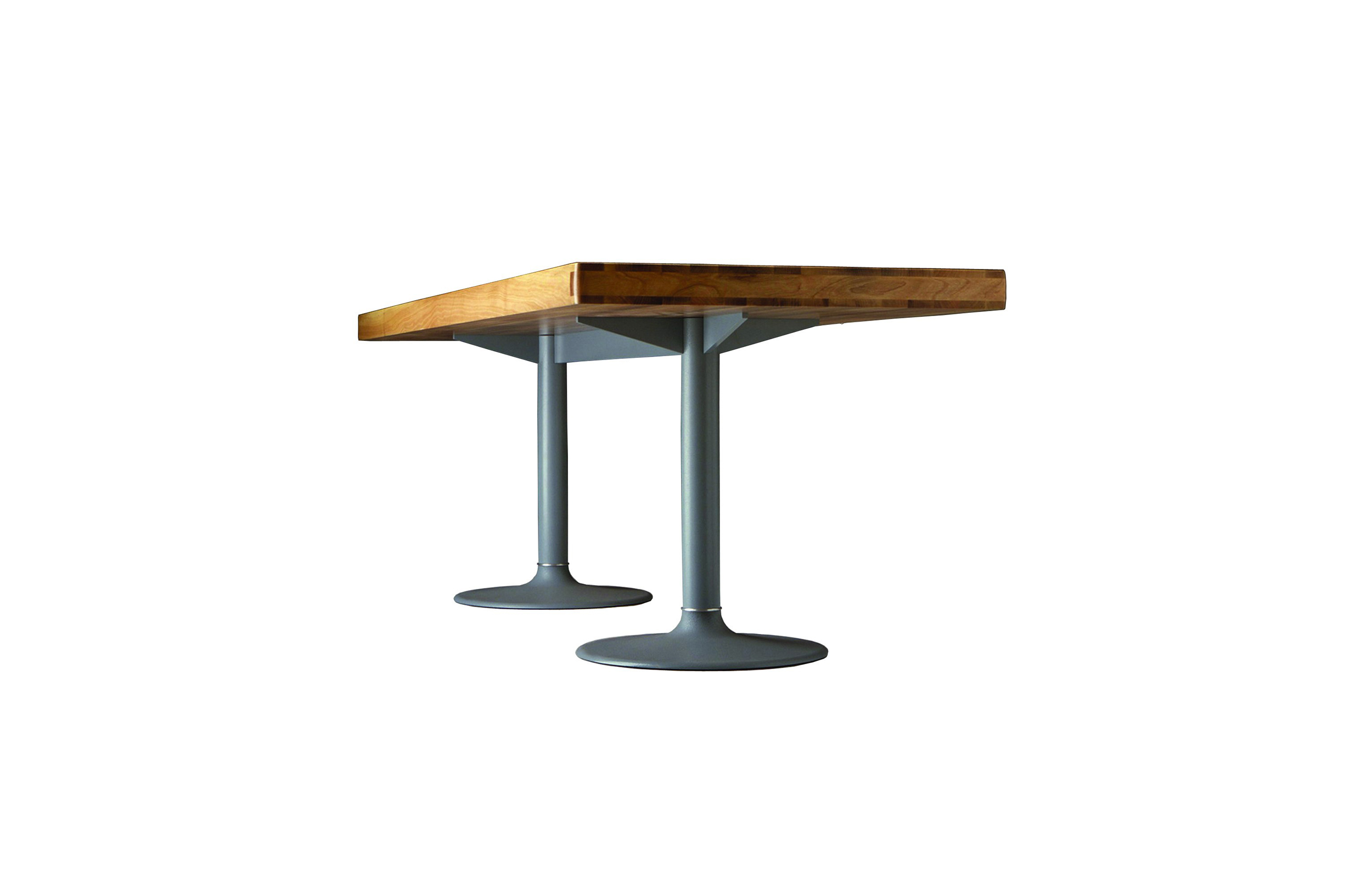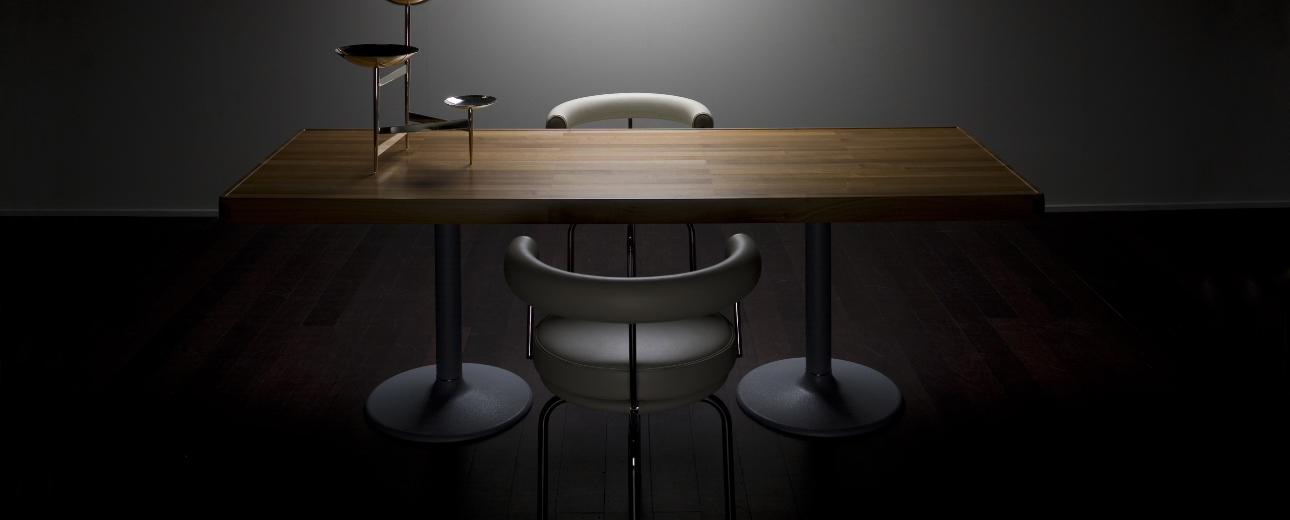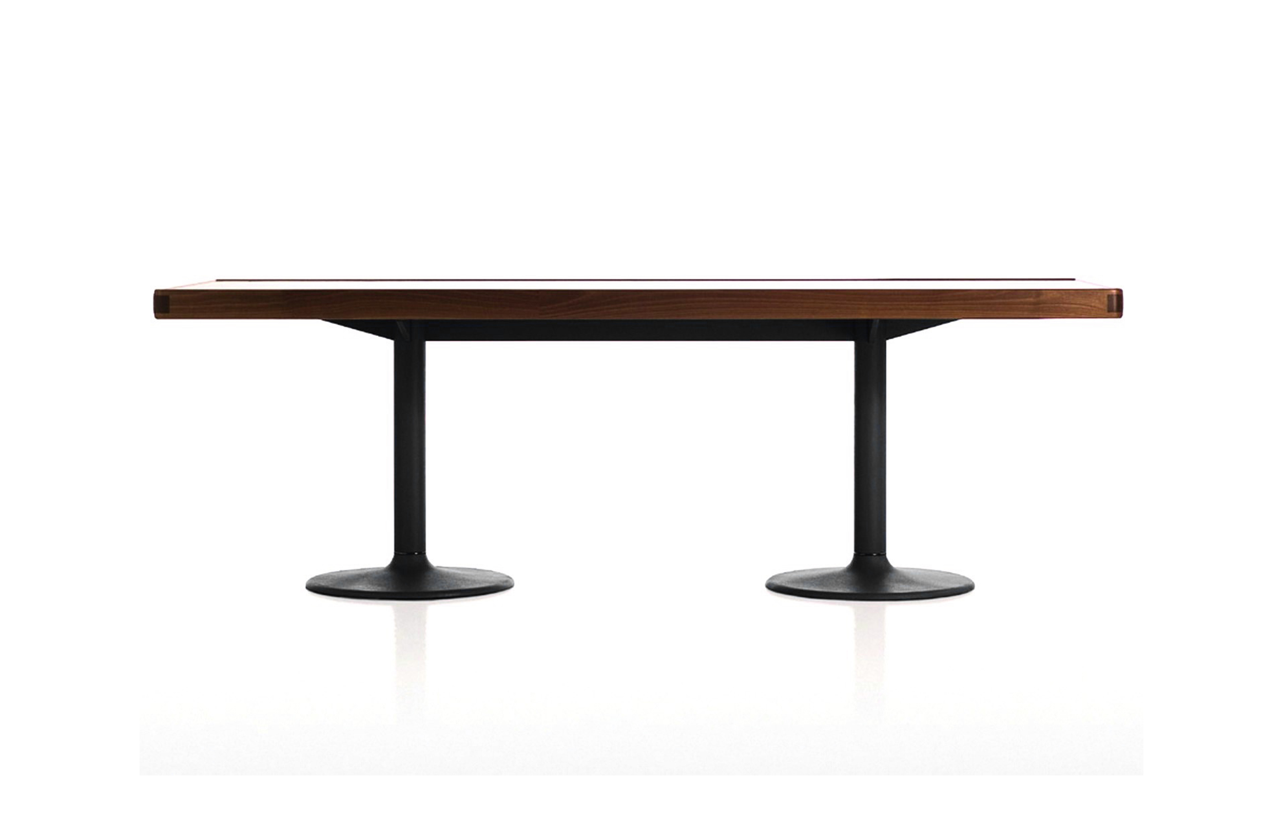 1984年的Charlotte Perriand设计的LC11复版。花冠脚桌。灰色搪瓷钢架机构和铸铁基底。一种采用哑光清漆胡桃木桌面(长220 cm - 86.6"),另一种采用卡拉拉大理岩桌面和灰色铸铁桌腿(长213,5 cm - 84")。包括二种基本型式的餐桌,第一种于1934年为Le Corbusier的Rue de Nungesser et Coli区巴黎公寓创作,第二种于1935年份为布鲁塞尔Maison du Jeune Home设计。