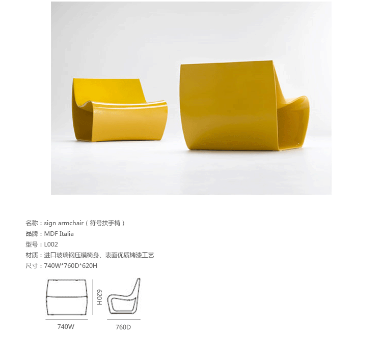 Sign系列座椅是由意大利设计师Piergiorgio Cazzaniga于2006年为MDF Italia公司设计,并在同年的米兰家具展上正式推出。该系列设计共分为:座椅、扶手椅和躺椅三款,外形均是由一种空洞形状作为标准基础,通过不同高度的演变,进而形成了具有强烈一致性的三部曲座椅。该系列座椅的流线型表面贴合人体曲线,因此其具有高度的舒适感,其独立支撑的构架是采用聚酰胺经过流动浇铸而成,表面涂有高质量的丙烯酸涂料,为座椅表面提高了光泽度、耐磨度及硬度,衣物或日常生活中所造成的小磨痕都可用一般家具清洁亮光剂轻松除去。Sign系列座椅带有一个直径为9毫米的排水孔,更加利于人们在户外使用。此外,该座椅还配有4种不同的小脚垫,且易于更换,这除了可以保护座椅本身外,也可以避免移动摆放时对地面造成损伤,对于陶瓷、木制、地毯、油毯等地面都很适用。该系列的三款座椅均分为红、白、黑、黄四色。