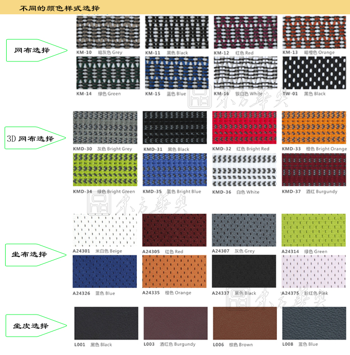 背垫、腰枕及座垫均为进口网布;黑色塑胶框架,TPU扶手垫;头枕插条、头枕横把手、背支撑架、扶手垫支撑座、扶手升降按钮、扶手内管、底盘支撑架均为铝合金精抛光;100MM气压棒,340MM铝合金精抛光椅脚,65MM PU滑轮;