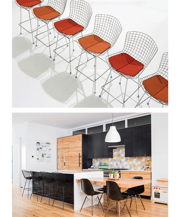 bertoia stool(伯托埃凳)是美国设计师伯托埃设计的,1950年,Harry Bertoia尝试用钢枝制造出结实、轻便而又经济的椅子。1952年,他通过弯曲的金属棒来设计出这张极具创意的伯托埃吧椅(Harry Bertoia Barstool),这张椅子适用与餐厅、酒吧、高档会所等地,利用了金的外形给椅子赋予了现代感,因为生产简单、材料简便,时候大规模的生产,非常适用于商业空间,这或许就是设计的力量可以改变 经济结构吧。