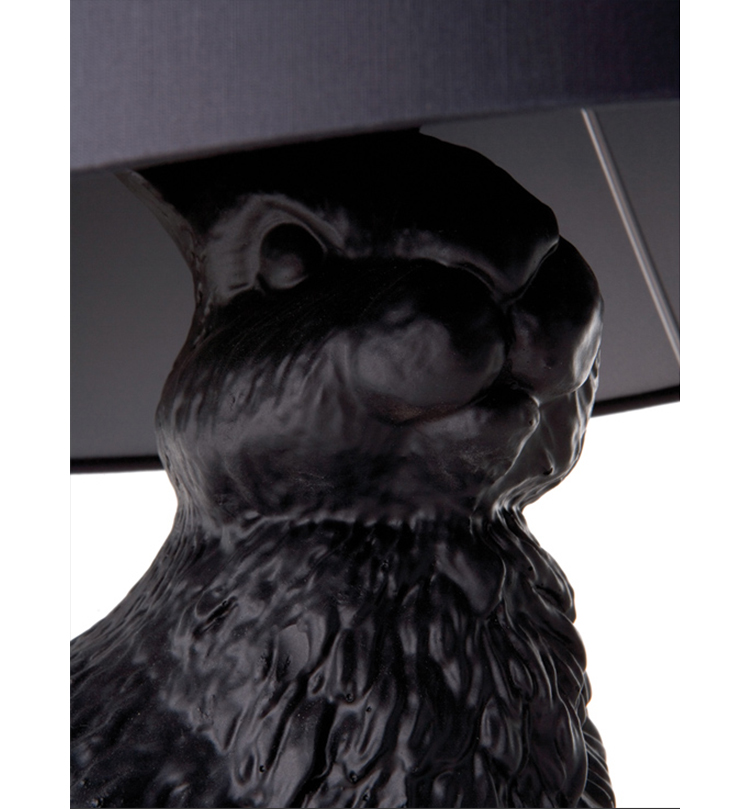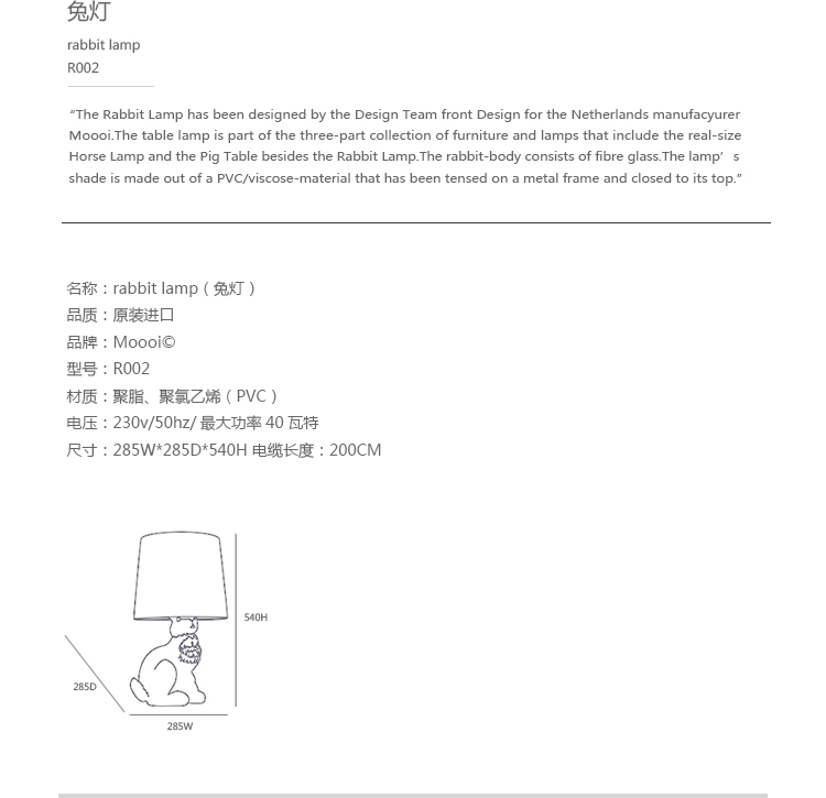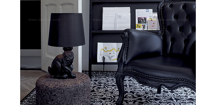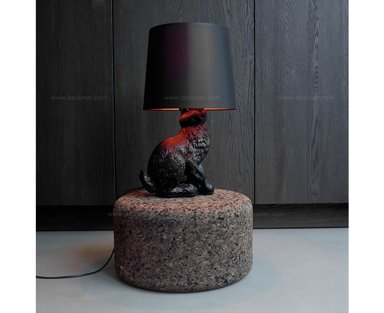 "The Rabbit Lamp has been designed by the Design Team Front Design for the Netherlands manufacturer Moooi. The table lamp is part of the three-part collection of furniture and lamps that include the real-size Horse Lamp and the Pig Table besides the Rabbit Lamp.The rabbit-body consists of fibre glass. The lamp’s shade is made out of a PVC/viscose-material that has been tensed on a metal frame and closed to its top."