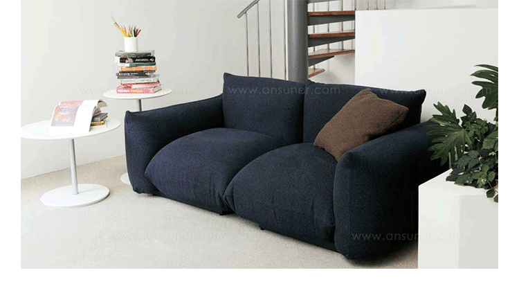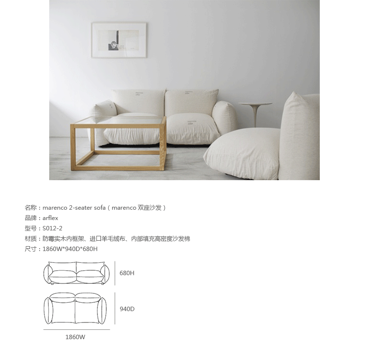 "marenco sofa系列沙发由设计师Mario Marenco在1971年所推出,Arflex公司出品,有单座,双座,三座,和五座组合形式。这款经典的沙发线条经典,舒适度饱满,成为摩登家居用品经典作之一。外型以简约细腻的北欧设计为方向,轻盈的金属脚架与薄型扶手,在厚薄粗细之间,视觉比例的层迭丰富,融合义式沙发中柔软舒适的元素,靠垫内衬高密度泡棉,兼具支撑性与松软度。这套沙发采用革命性的方式组合,垫子及扶手都是独立的部分。枕头是挤压钢管的金属框架,提供了刚性和耐用性。胶合板基地加上纤维覆盖。制作采用防霉实木内框架、进口羊毛绒布、内部填充高密度沙发棉,保证了高品质的奢华与舒适。