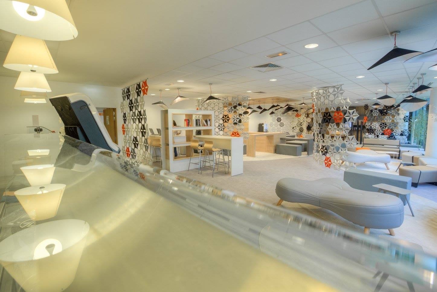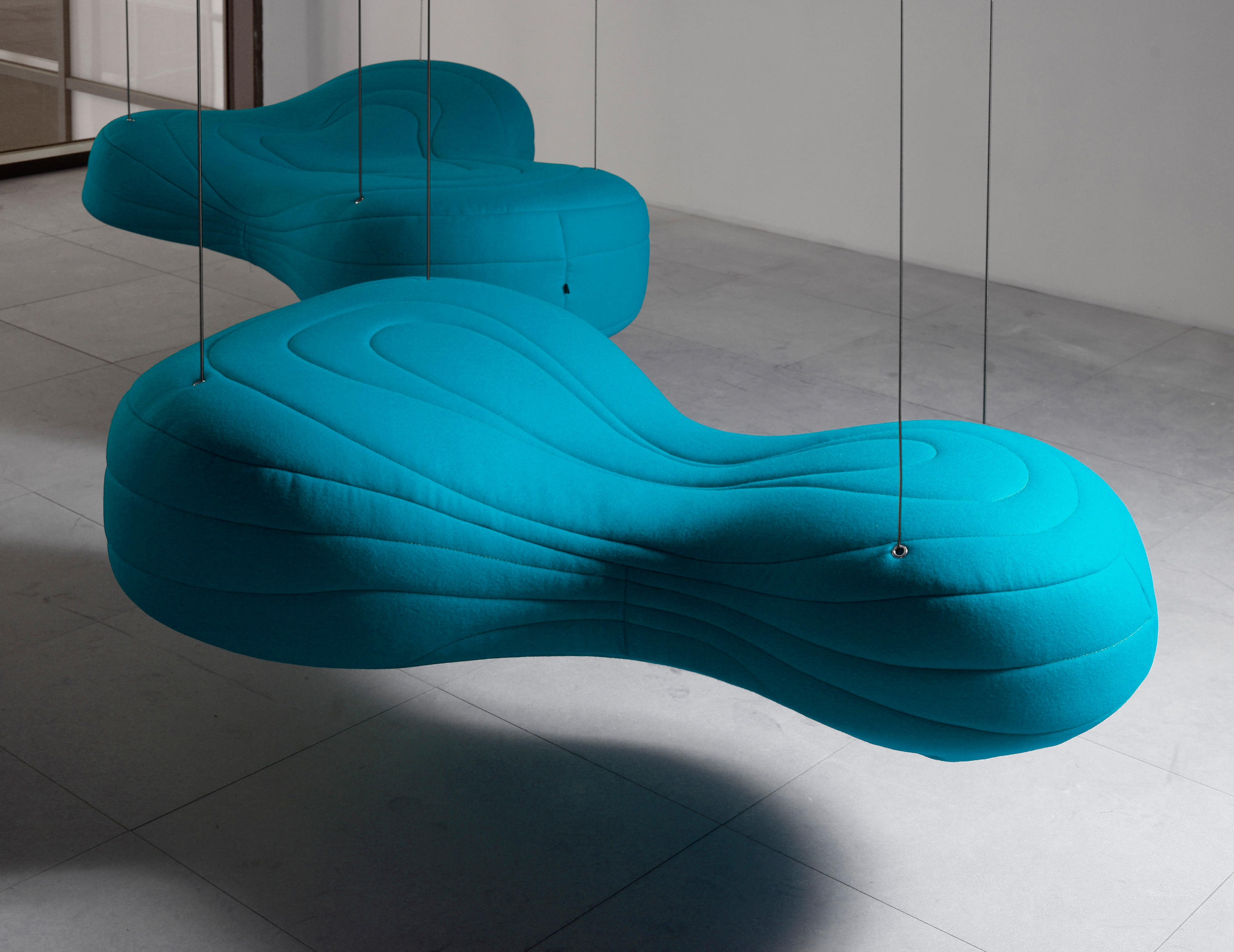 不规则的、变形的沙发形式允许创造一个不寻常的公共空间。这些模块是用木制的腿,小的隐藏的腿,这样沙发看起来就像是直接躺在地上,或者悬挂在绳子上,给人一种漂浮在空中的感觉。设计的主要特点是有可能在功能和外观方面提供不同的基础。这些座椅有两人位和三人位型号可供选择。