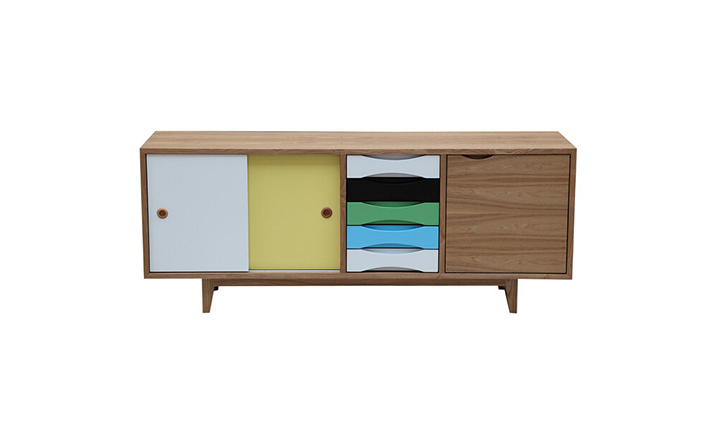 vodder sideboard(vodder餐具柜),Arne Vodder设计的作品,是Kardiel公司制作的经典实木家具,具有世纪中期的现代风格,加了少许复古现代主义色彩于其,微妙的局部拱曲线呈现在右手面对推拉门和5个拉出抽屉。在现代主义的存储家具上,Finn Juhl和Arne Vodder最先尝试胶木和天然木的组合运用。这是大胆的创新,他们结合传统的新鲜的新兴技术与现代主义的概念。制作采用精选MDF板基材胡桃木或水曲柳木皮贴面、胡桃实木或水曲柳实木脚架、环保油漆喷涂、做工精湛,是您理想的选择。