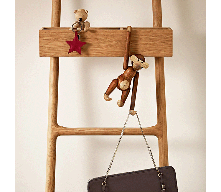 Kay Bojesen Monkey(Kay Bojesen 猴子)出自丹麦设计大师 Kay Bojesen 的设计作品,设计于1951年,精致的木制动物系列,是 Kay Bojesen 为人熟知的珍藏作品系列,采用不同的橡木、枫木、柚木等原木素材,保留木材的独特纹理,刻画出各种不同让人莞尔一笑的动物姿态,跳脱生活中的烦琐与紧张,简单的玩偶,轻松的神情,带您回归孩时的天真与简单快乐。精致而限量珍藏的作品系列,适合您作为桌面摆设,或是作为送礼小物,分享您生活中的快乐写意。可爱的小猴,可摊坐、吊挂树上、摇晃走路等,自在摆出您喜爱的完美姿态。英国著名杂志 Wallpaper,曾一次摆出 50 只不同姿势的猴子,带动您的全面想象和创造力。