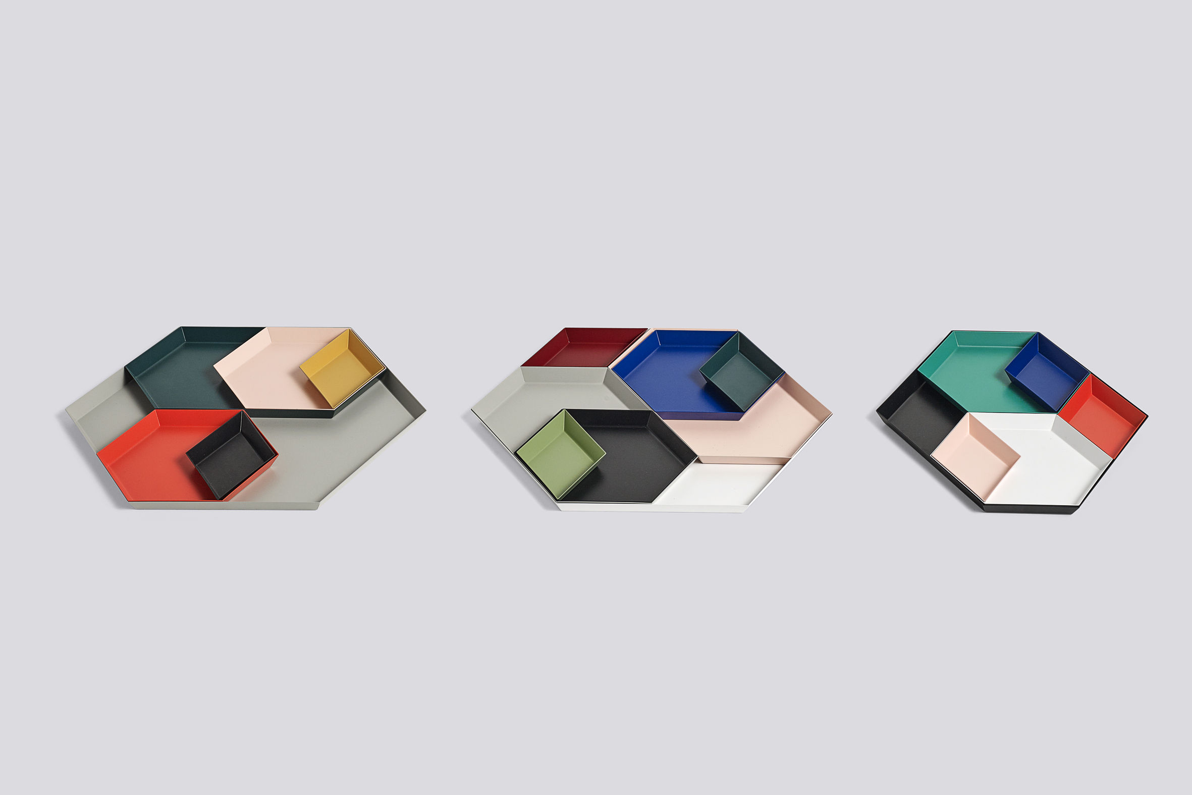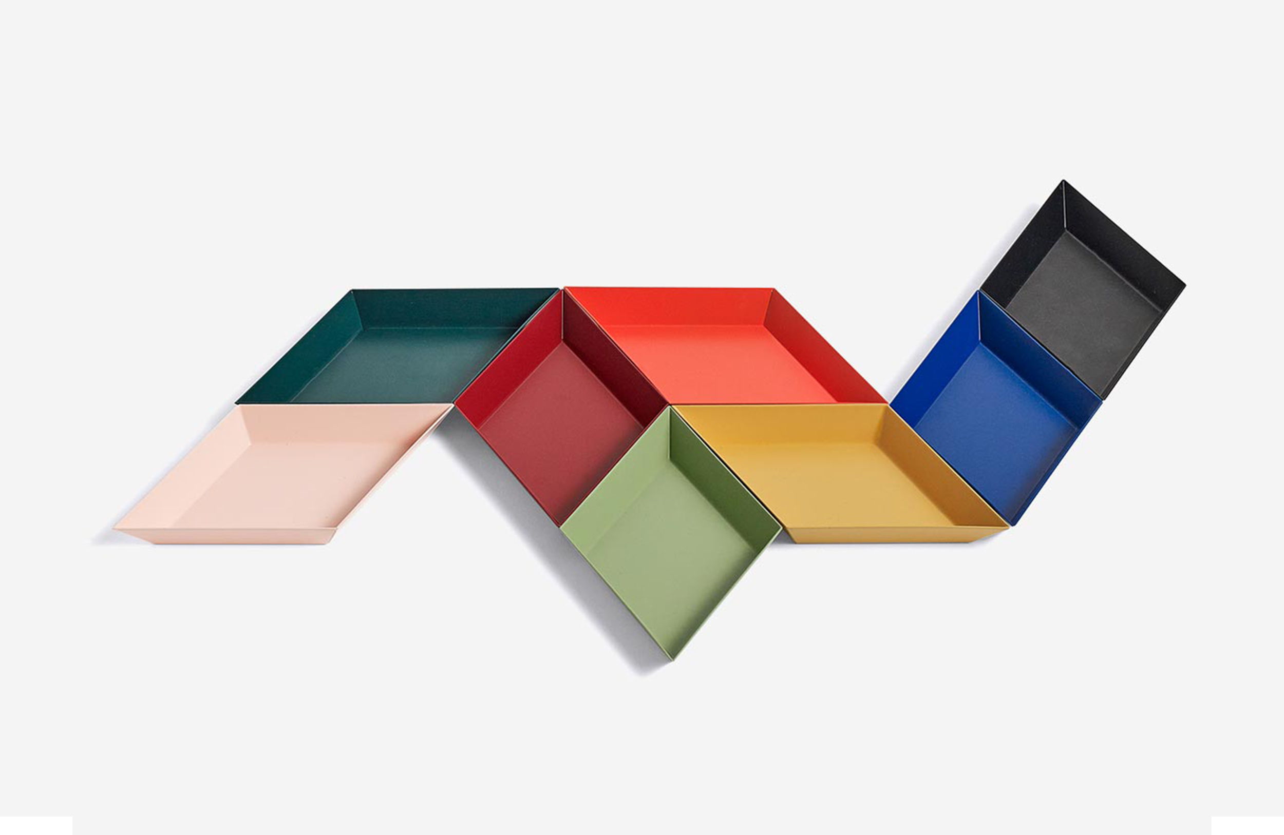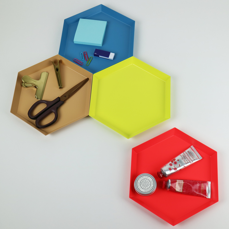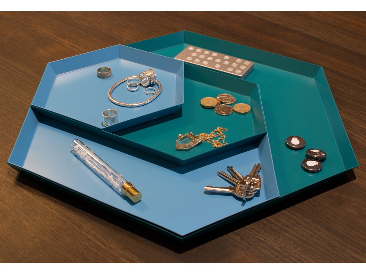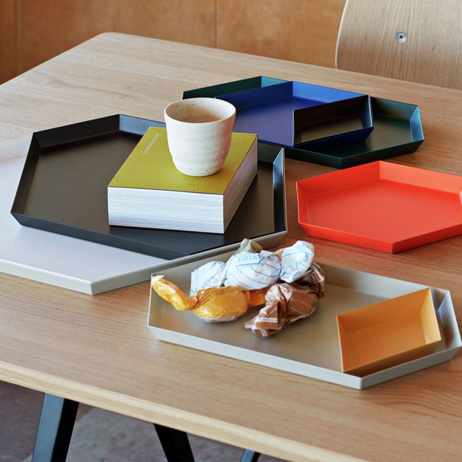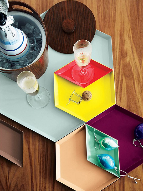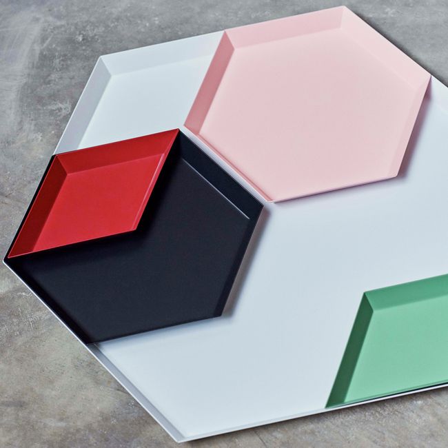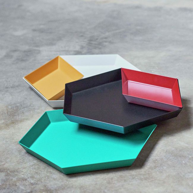 Clara von Zweigbergk的背景是一位平片设计师,这点在她的Kaleido托盘的配色上就很显而易见了。在那里她的直觉感的色彩组合体现在不同的形状和色调上。这个系列的钢制几何形状的托盘可以单独使用,或者折叠在一起储存时也可以创造出不不同的想象力组合。