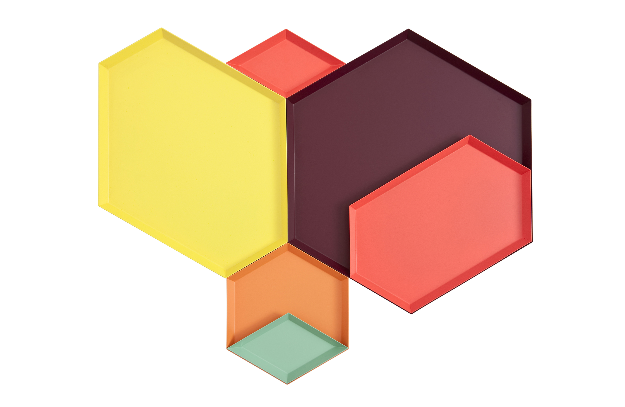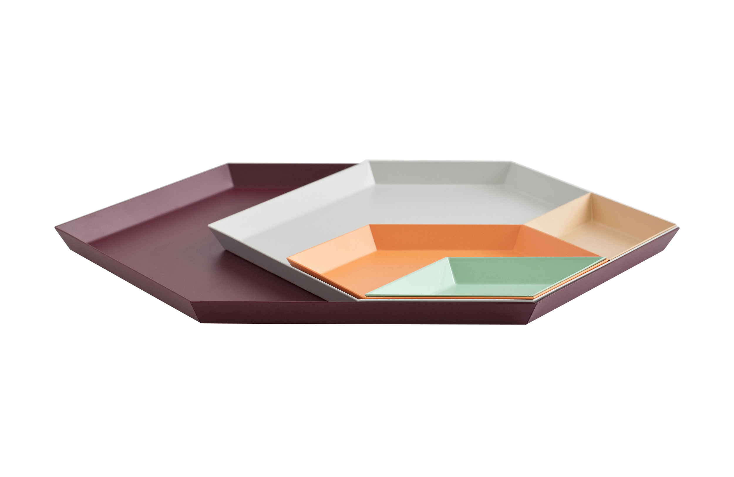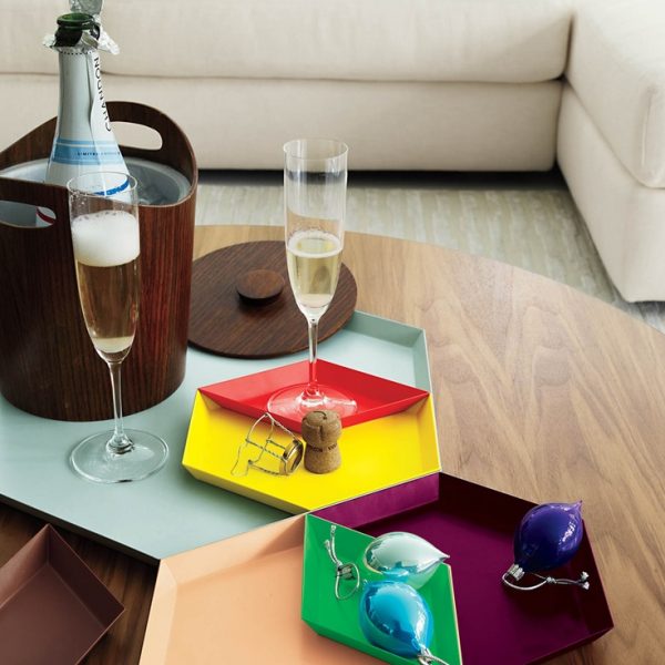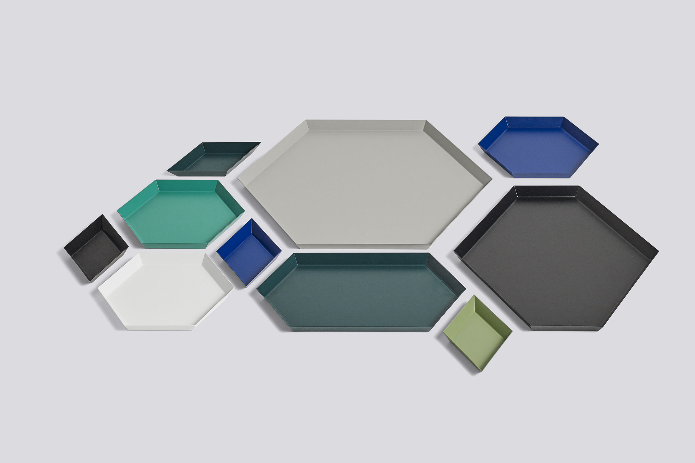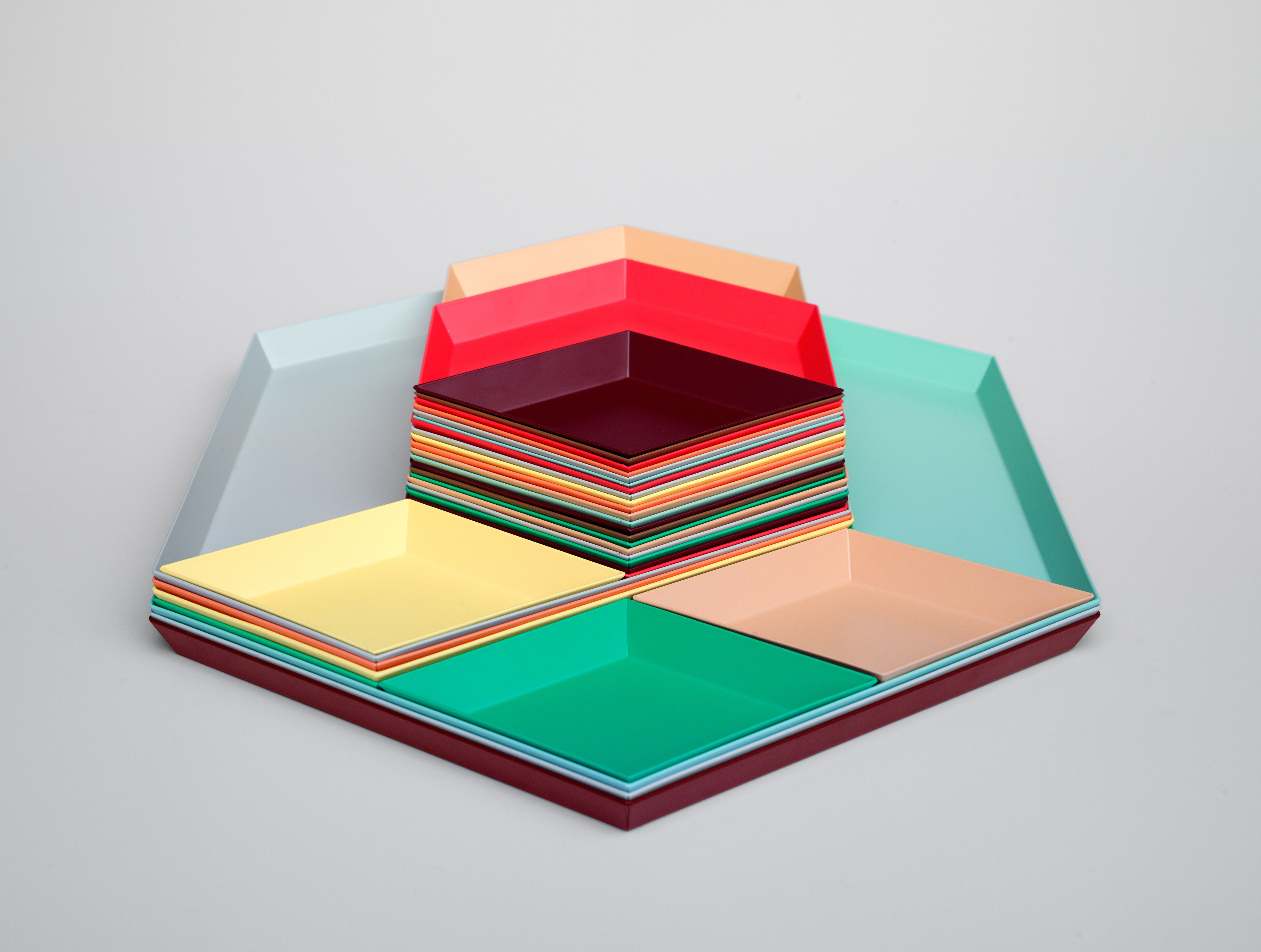 Clara von Zweigbergk的背景是一位平片设计师,这点在她的Kaleido托盘的配色上就很显而易见了。在那里她的直觉感的色彩组合体现在不同的形状和色调上。这个系列的钢制几何形状的托盘可以单独使用,或者折叠在一起储存时也可以创造出不不同的想象力组合。