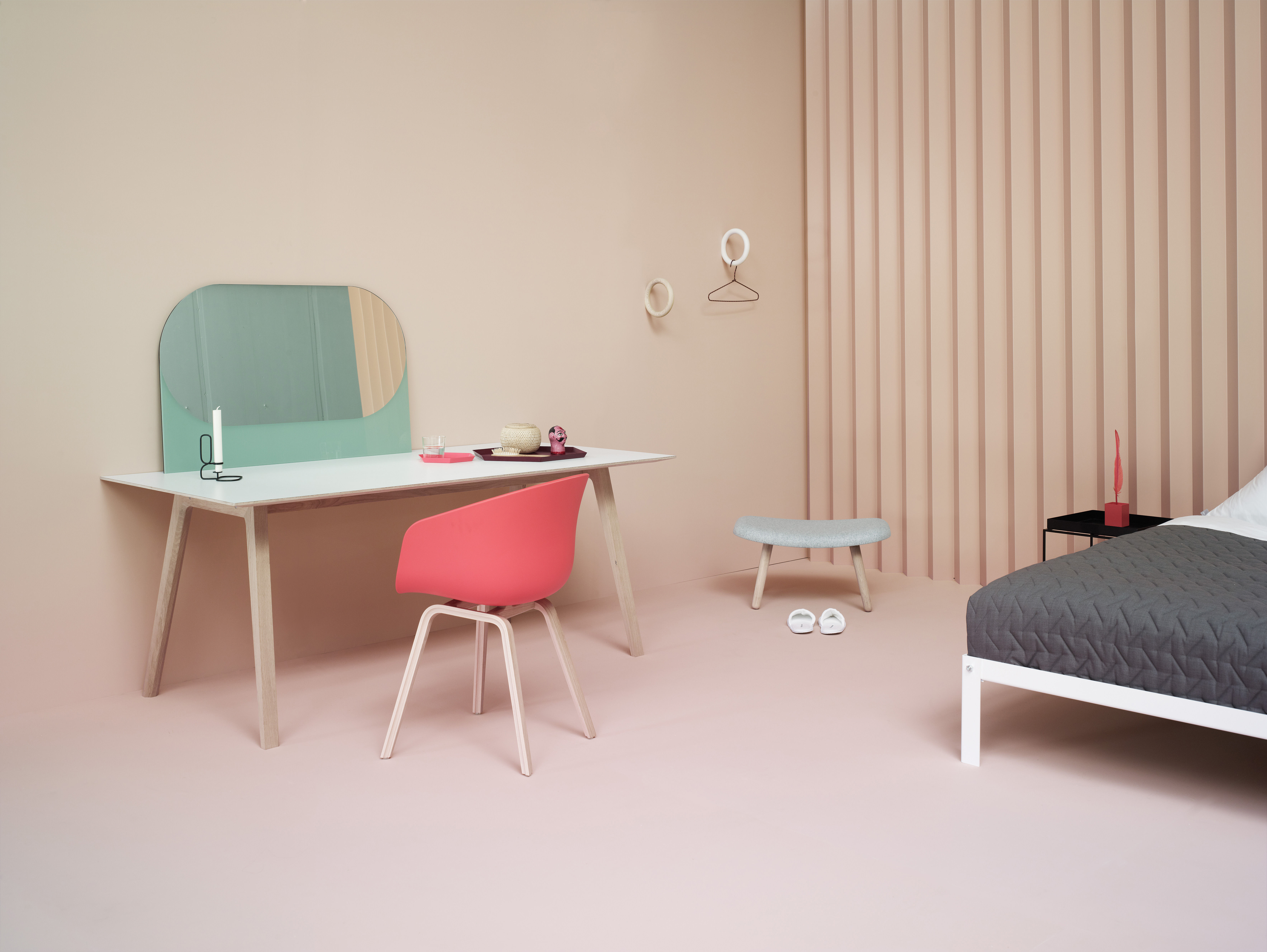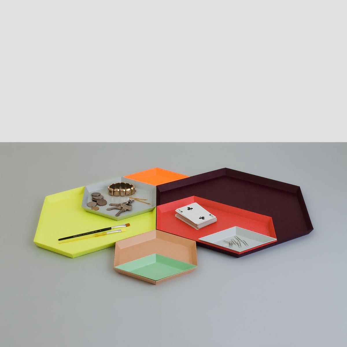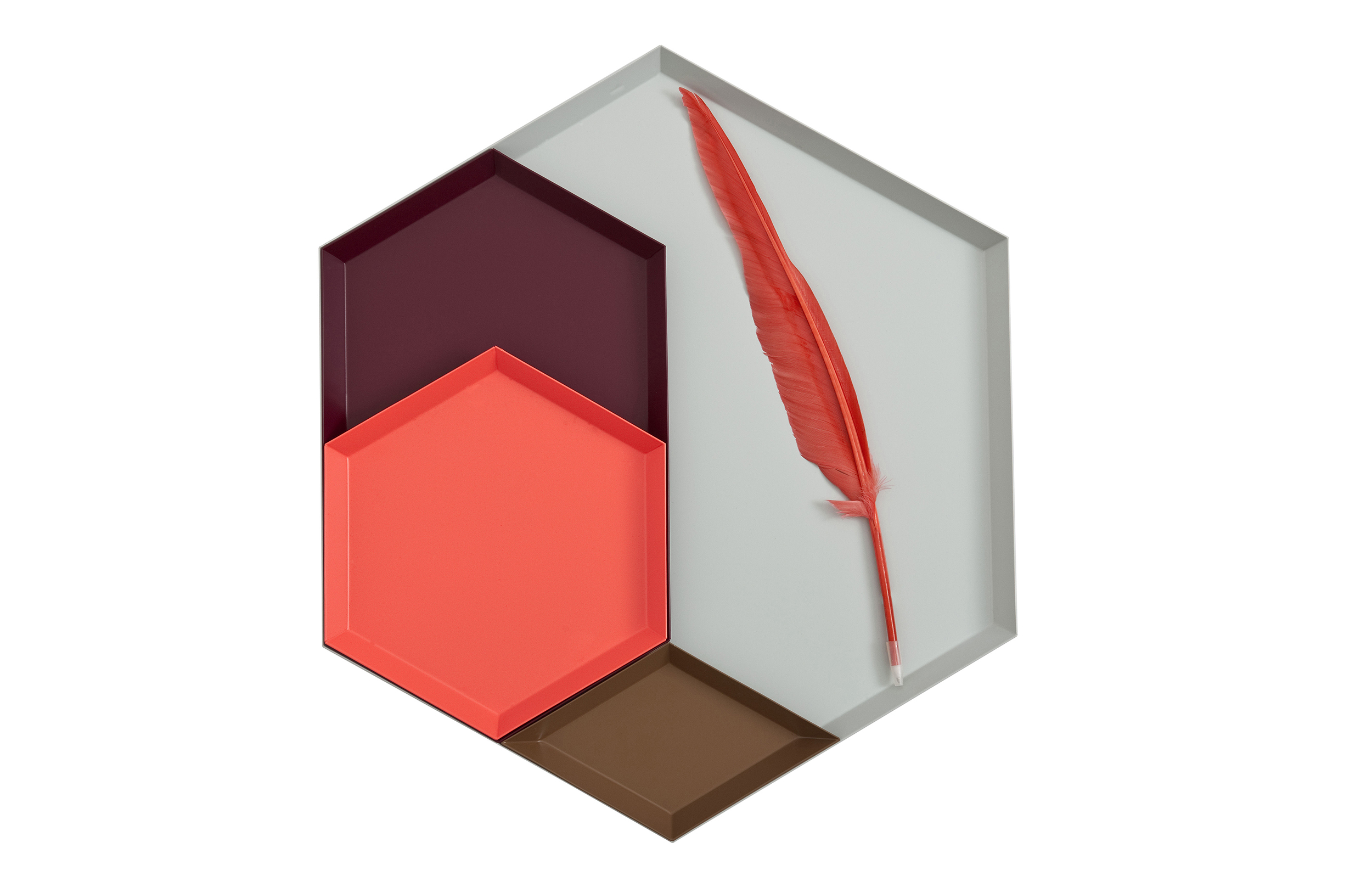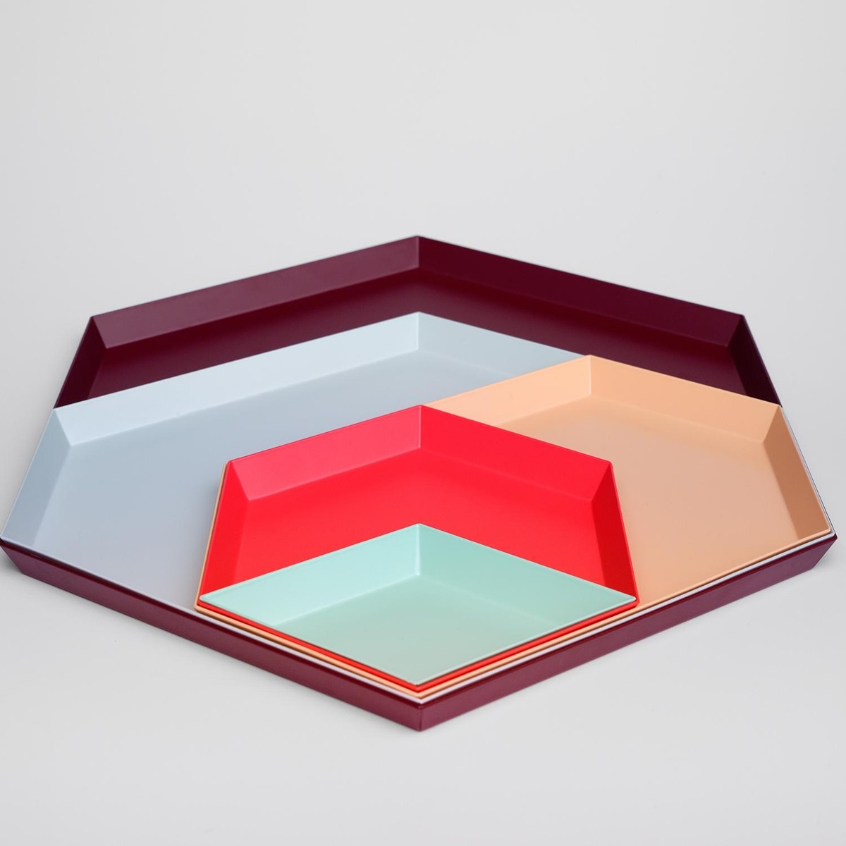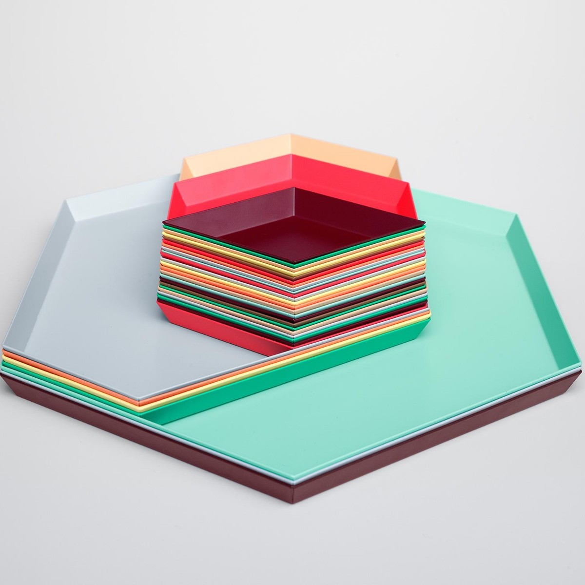 Clara von Zweigbergk的背景是一位平片设计师,这点在她的Kaleido托盘的配色上就很显而易见了。在那里她的直觉感的色彩组合体现在不同的形状和色调上。这个系列的钢制几何形状的托盘可以单独使用,或者折叠在一起储存时也可以创造出不不同的想象力组合。