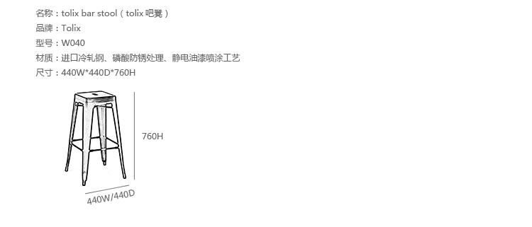 tolix chair(tolix椅)一把有味道、有态度的椅子,据说它最开始被使用在一艘战舰的天气预报房间里,故事的真实性与否不得而知,但是不影响其成为享誉世界的著名设计家具,1934年由Xavier Pauchard设计,早期是作为户外用家具设计,力图展现法式慵懒而闲适的气质,经年而来被全世界时尚设计师所宠爱,从室外扩展到家居、商业、展示等多个用途,而此椅也不负众望在各类空间中均有上佳表现,特别是近年来与混搭、乡村、美式、怀旧、北欧简约、中式等主要装修风格搭配,都呈现出独特的韵味,也被时尚界赞为“百搭第一”椅,可以用在酒吧,餐馆,咖啡馆等等地方,之后通过改进,设计出有扶手版本的tolix armchair(tolix扶手椅),高背版本的tolix high back bar stool(tolix高背吧凳),宽背版本的tolix wide back bar stool(tolix宽背吧凳),及tolix bar stool(tolix吧凳)和tolix mini stool(tolix迷你凳)。制作采用进口冷轧钢、磷酸防锈处理、静电油漆喷涂工艺、坐面为木板或PU海绵坐垫,颜色可选。