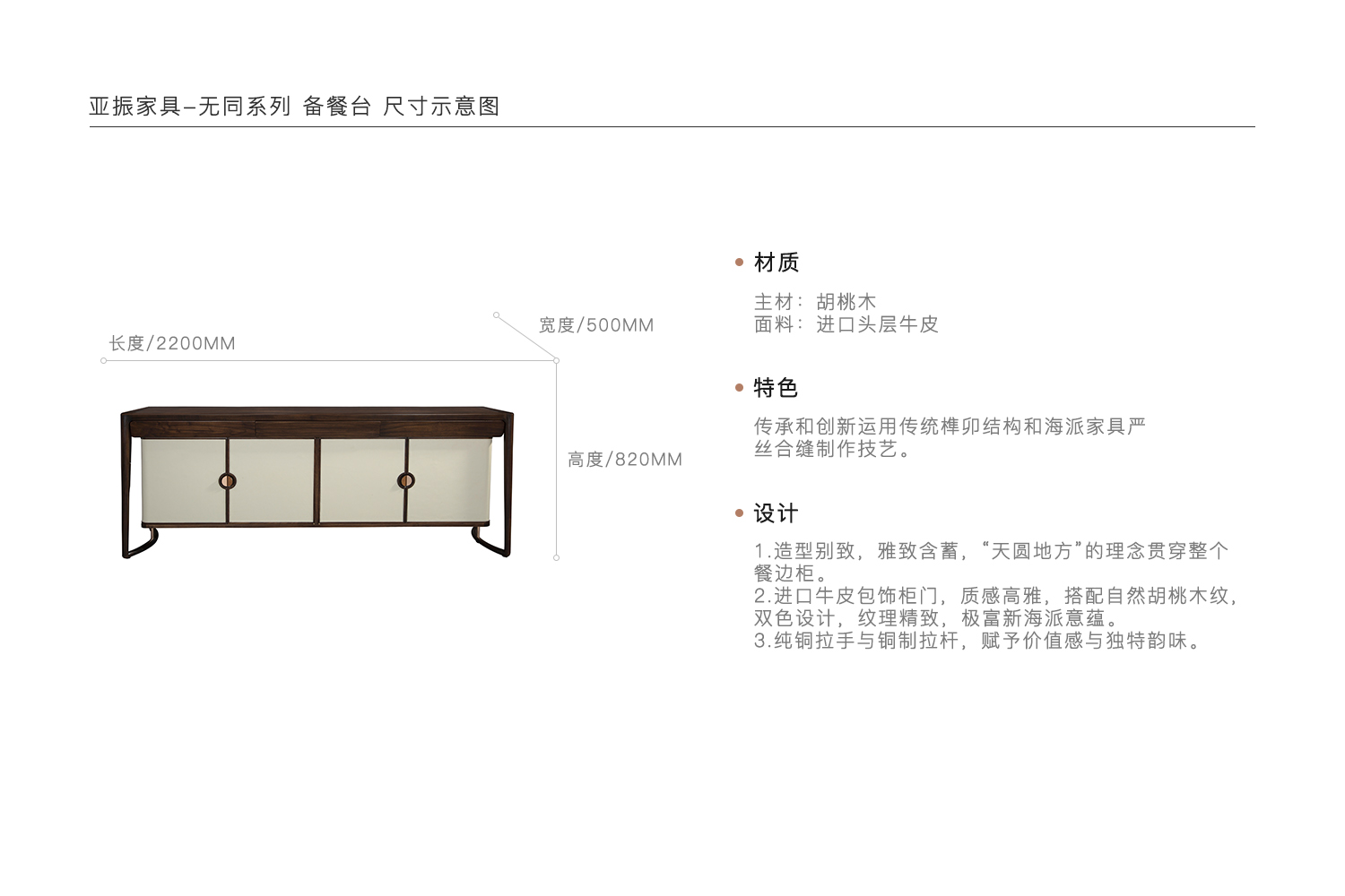 1.造型别致,雅致含蓄,“天圆地方”的理念贯穿整个餐边柜。 2.进口牛皮包饰柜门,质感高雅,搭配自然胡桃木纹,双色设计,纹理精致,极富新海派意蕴。 3.纯铜拉手与铜制拉杆,赋予价值感与独特韵味。