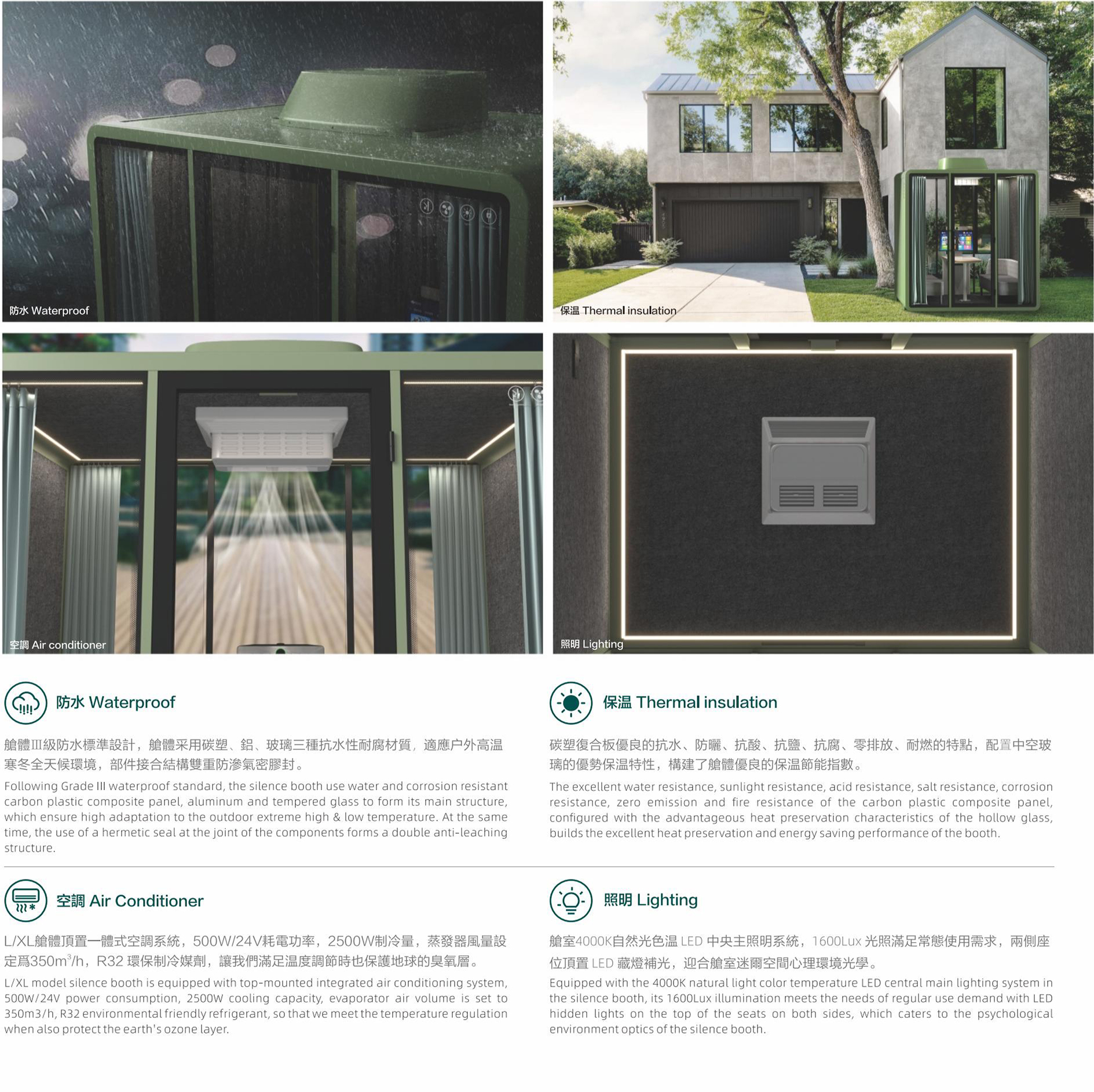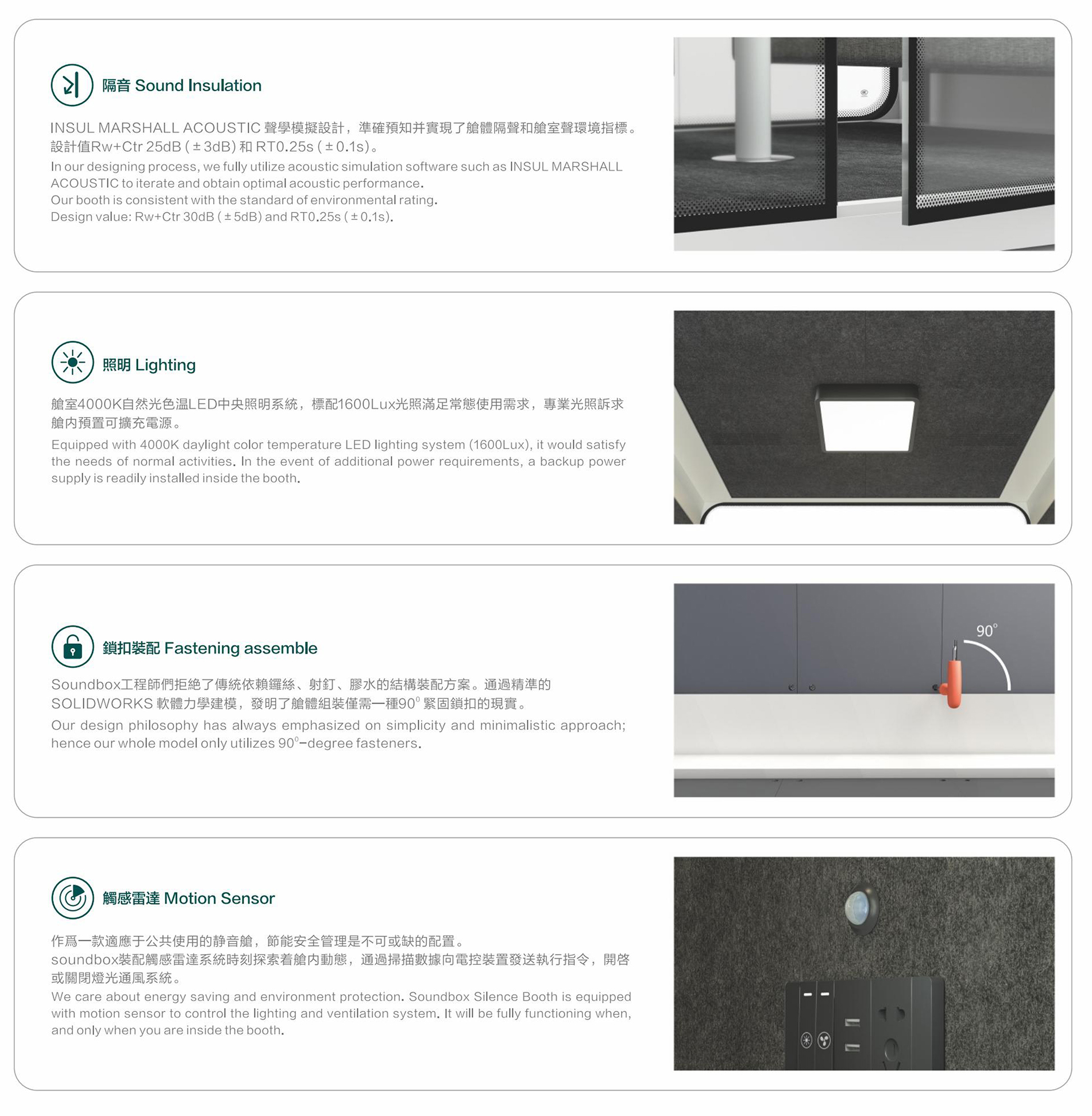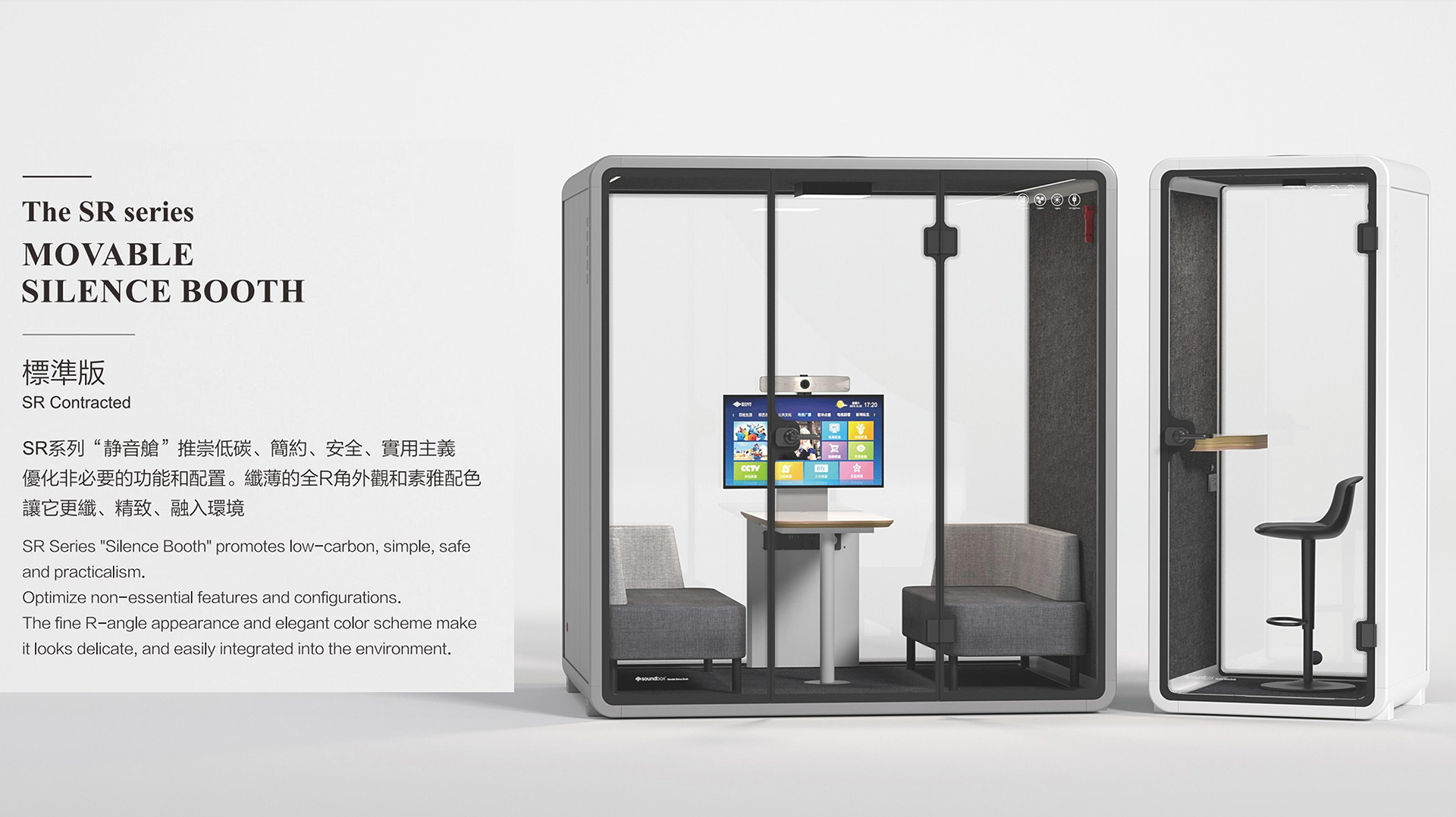 一个灵动的安静空间,满足您无限创想不传统的碳塑复合板、航空铝、隔声玻璃是它的主要组成,SOLIDWORKS软体力学建模让仓体组装仅需一种紧扣件,INSULMARSHALL ACOUSTIC 声学模拟设计准确预知并实现了舱体隔音和舱室音环境指标,它是一个强大,尽管它不是最完美的迷你空间,仓体采用可循环碳塑再生材料 SR系列 静音仓推崇低碳、简约、安全、实用主义优化非必要的功能和配置。从薄的全R角外观和互雅配色让它更精致、融入环境。