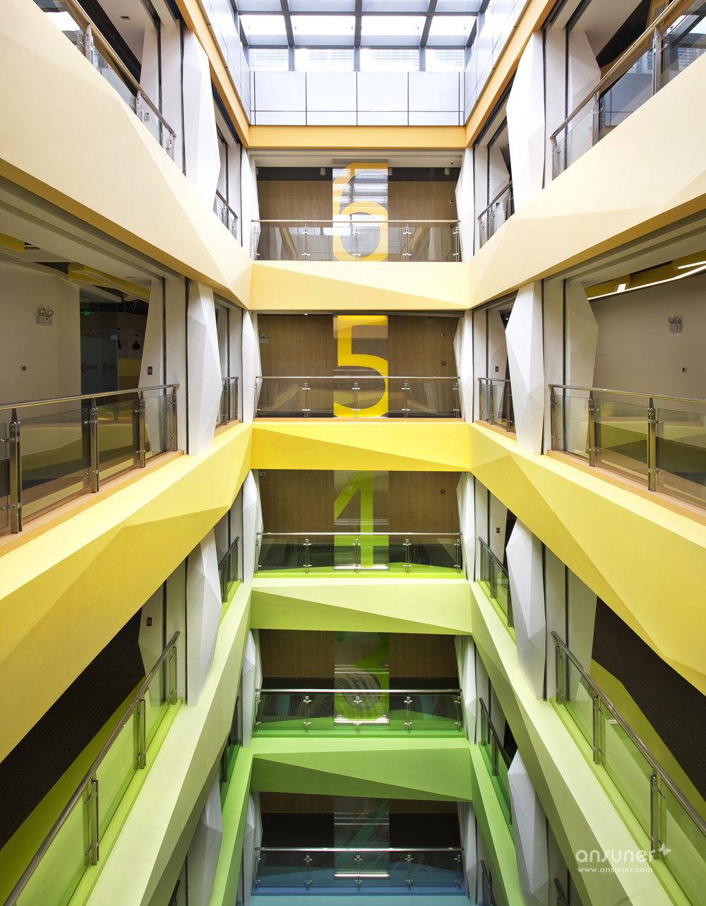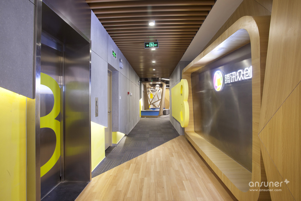 电梯厅运用每层的主题色,并通过阴刻立体式的效果将每层的标识放大,体现出互联网公司的创意、时尚之风。
