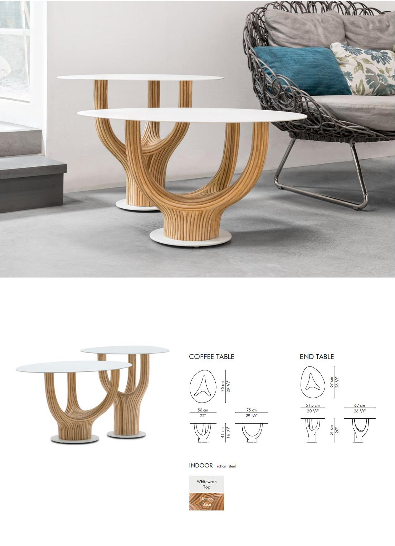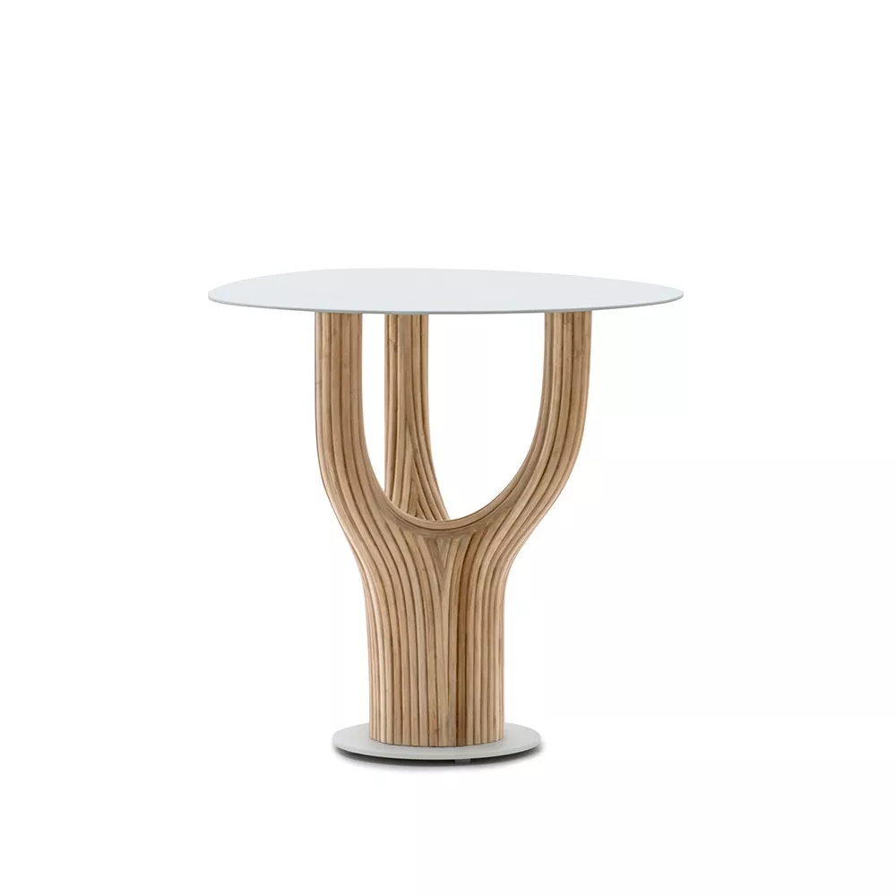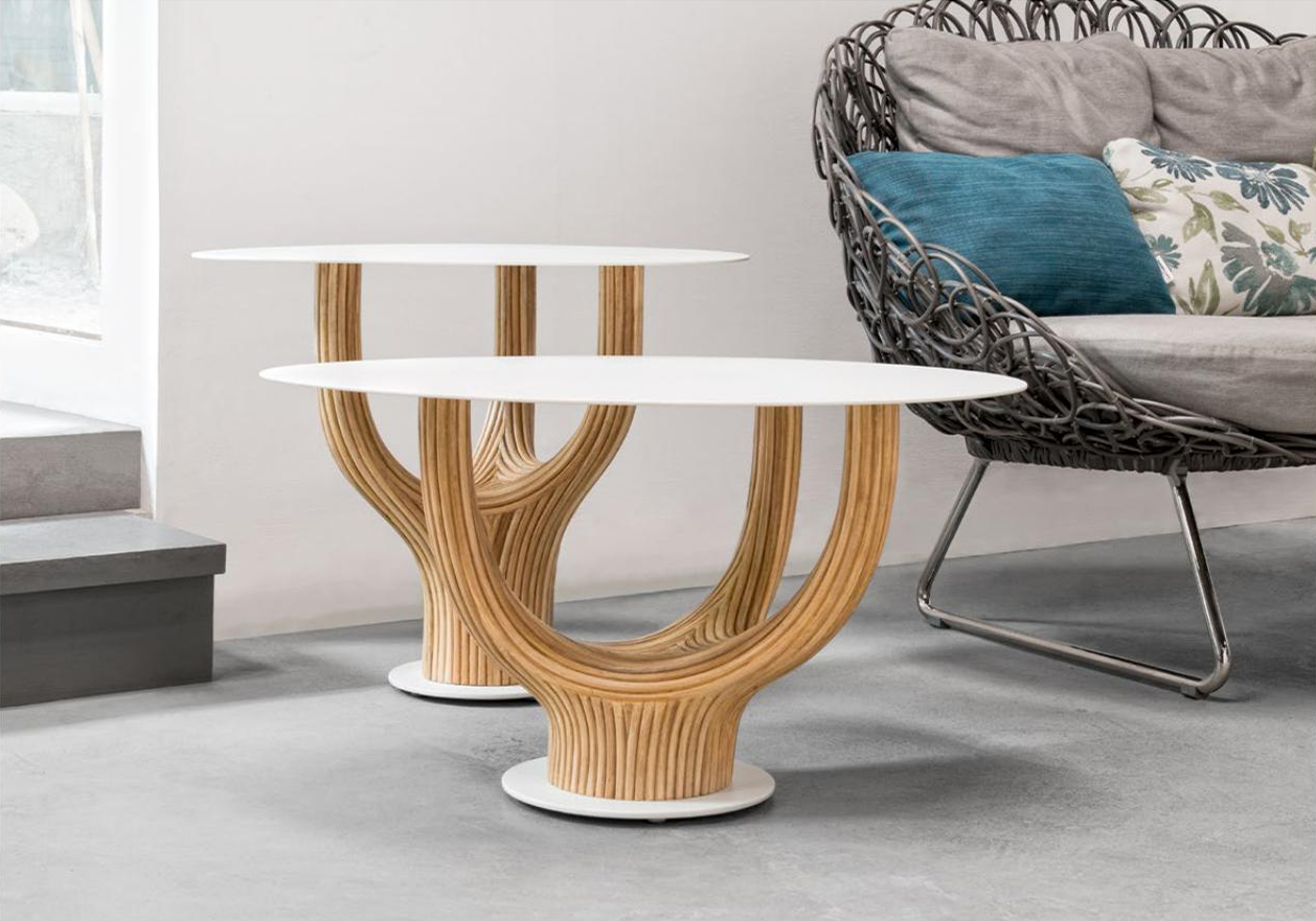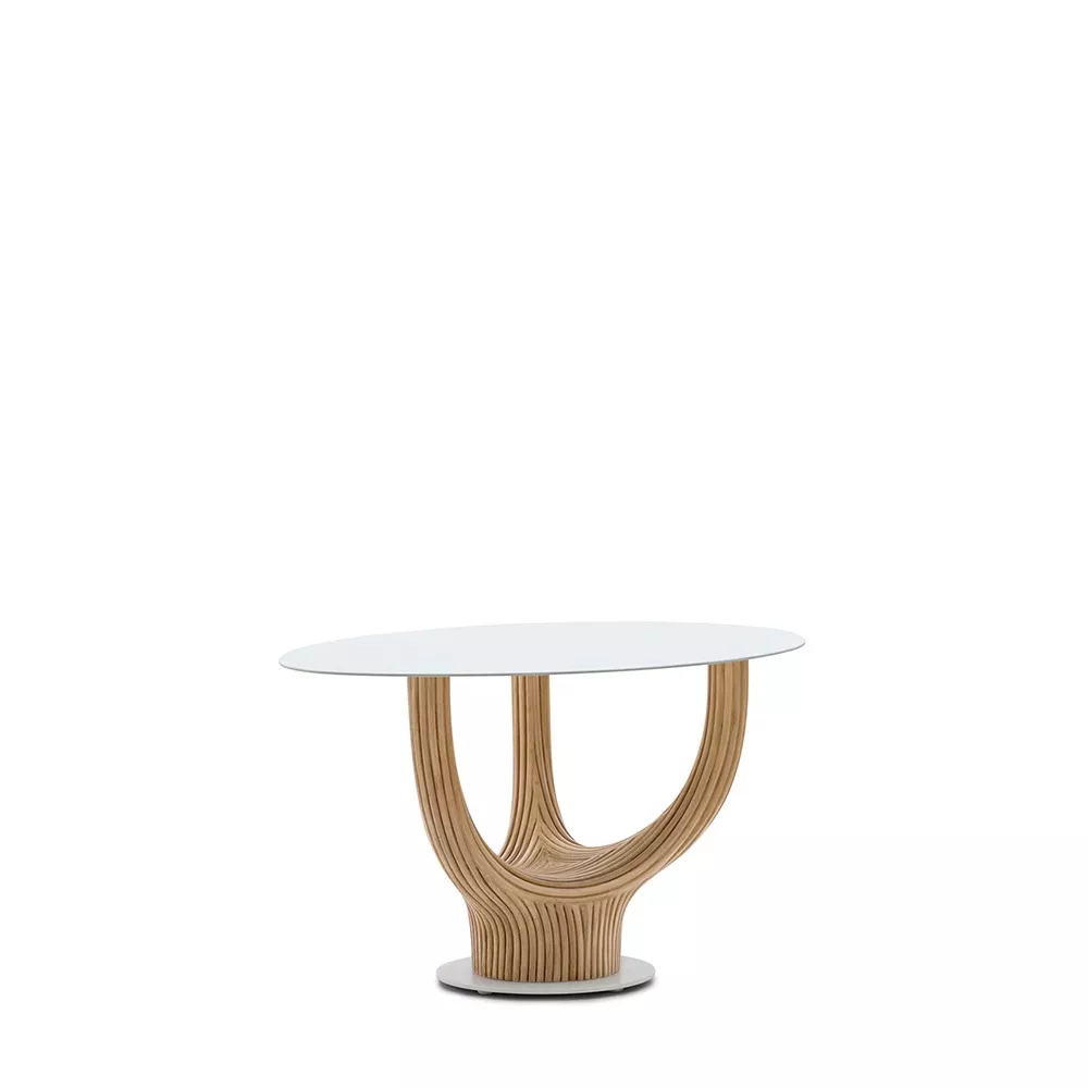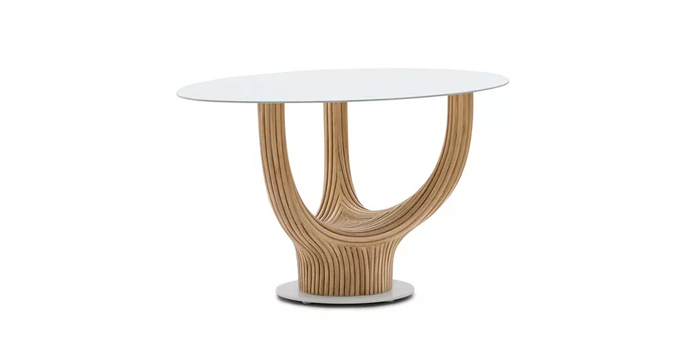 acacia藤制桌子系列的灵感来自古老的猴面包树,由藤杆固定在一起,创造出雕塑般流畅的轮廓。自然原始的藤条组合与更为流线型和简约的桌面形成鲜明对比。