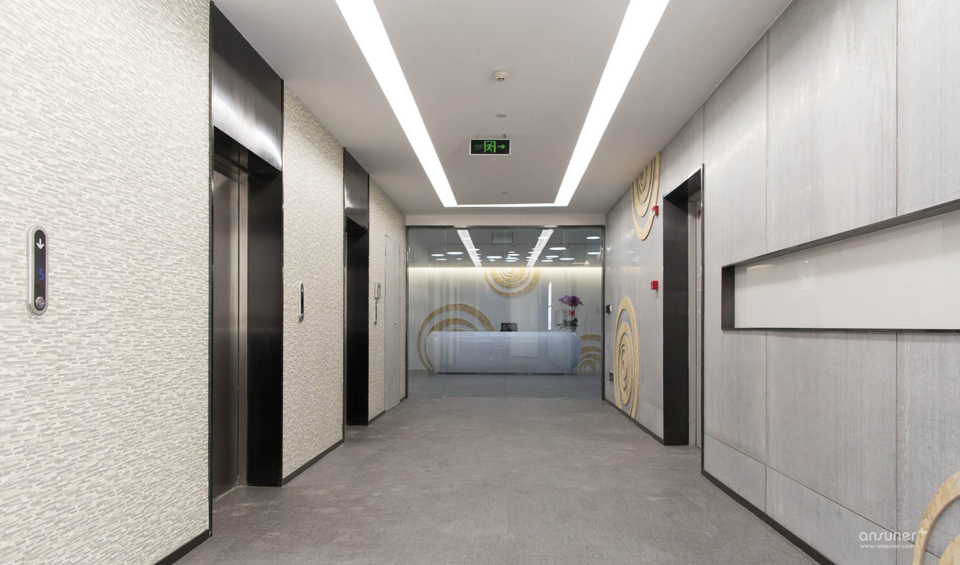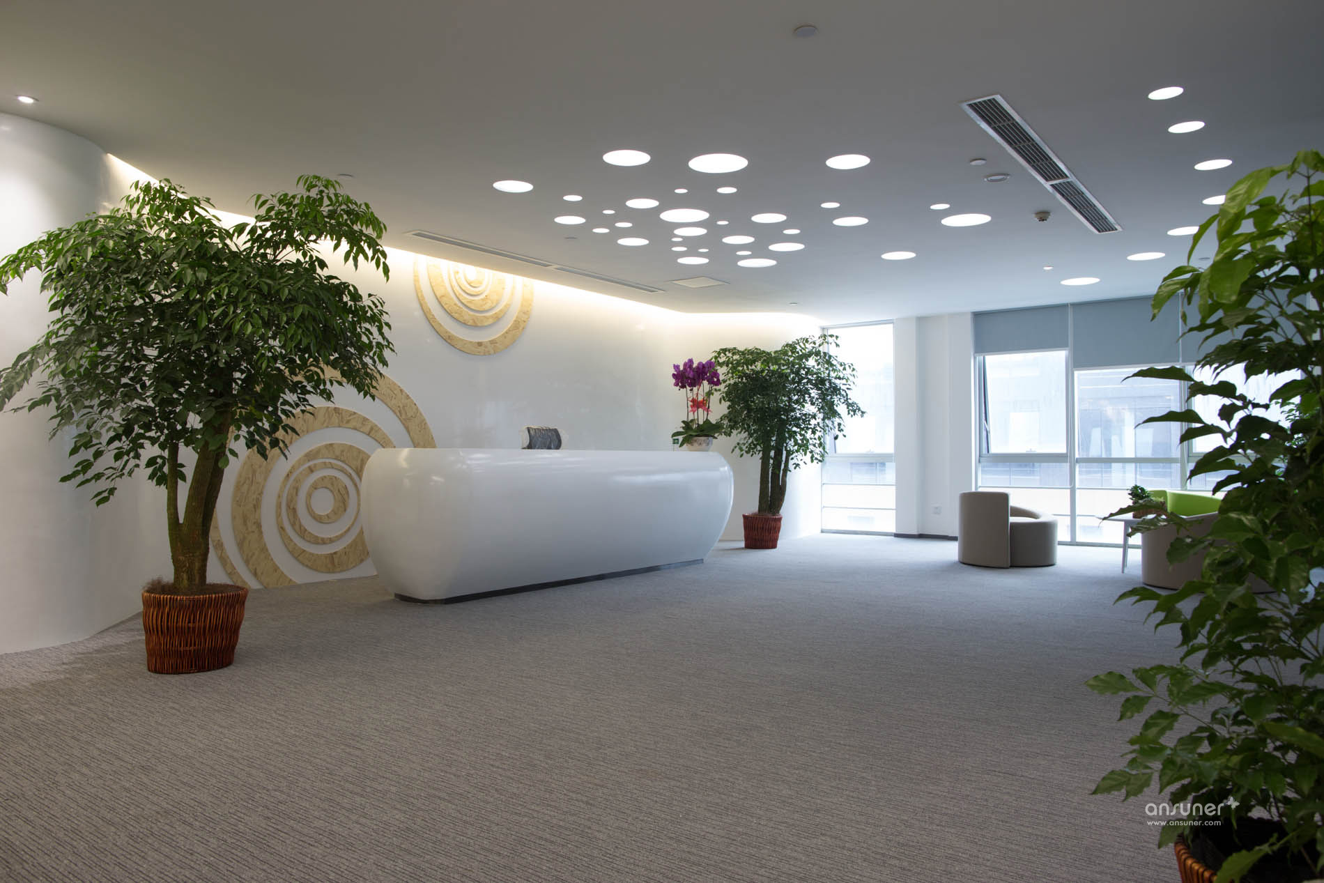 接待台后面的装饰墙上镶嵌着由小及大的圆环,彷如那神秘幽深的银河,是探索的方向。类比的“星空”、“银河”,在形式上做到了既不直白同时又能反映企业相应的特点,增强了对于华体会体育官方网站的体现。