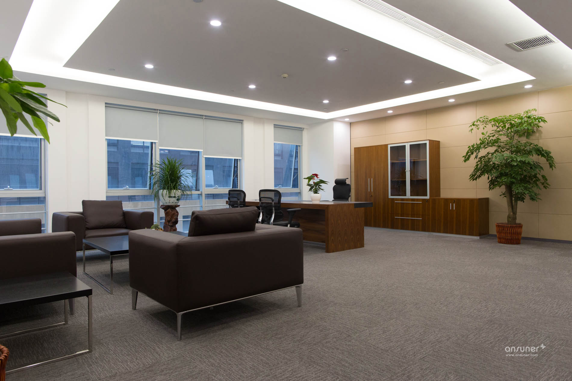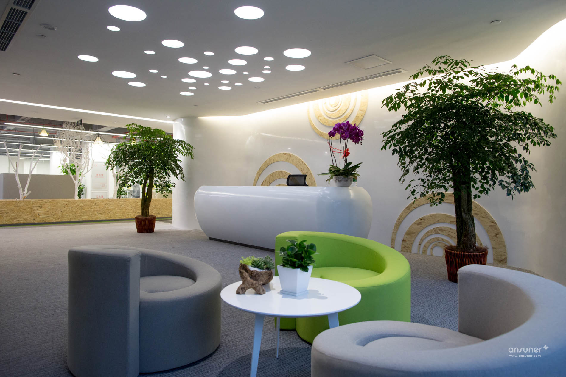 讨论区位于办公区和走道之间,为专注的工作隔开了几分喧嚣,也有益于彼此之间的沟通交流。休闲讨论区放置着弧形的沙发、靓丽的圆椅和可爱的收纳凳,为办公室增加了内容感和趣味性。间隔分布的绿色植物和红色、白色的枯木相对,多了几分自然的感觉。